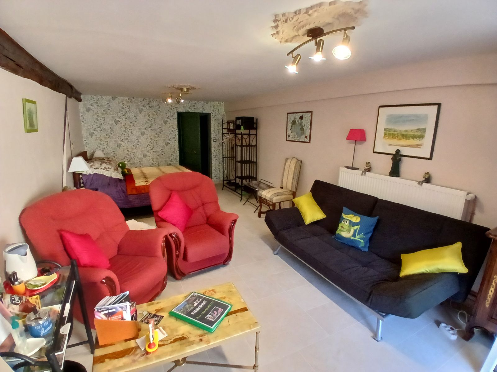 2ª habitación: Entresuelo: Situado entre nosotros, encima de la habitación hay 2 camas. Las vigas de la estructura son evidentes y una claraboya sido creados para colgar una lámpara de araña del siglo 18. El baño es compartido. Usted puede disfrutar de la gran sala de estar; relajante, lectura, televisión, dvd. De la terraza suspendida y el parque; tumbonas ...