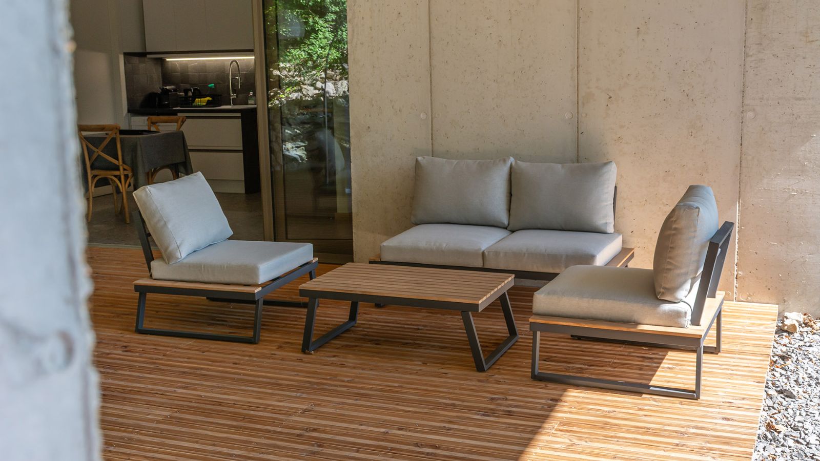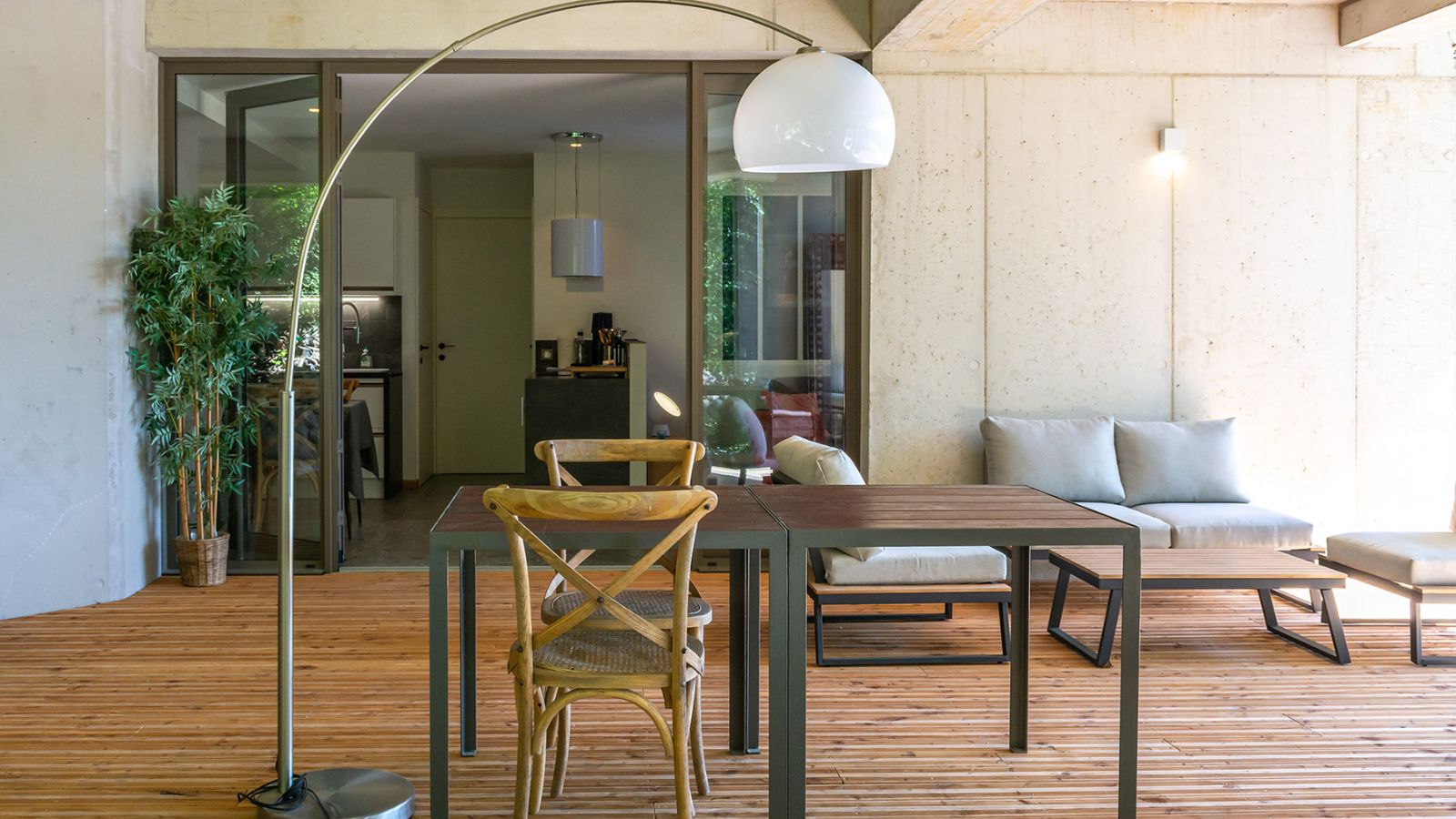 Sur la terrasse couverte de 50 m2, un espace repas, deux fauteuils et deux chaises longues, un vieux meuble de métier sur lequel vous pourrez installer la plancha.