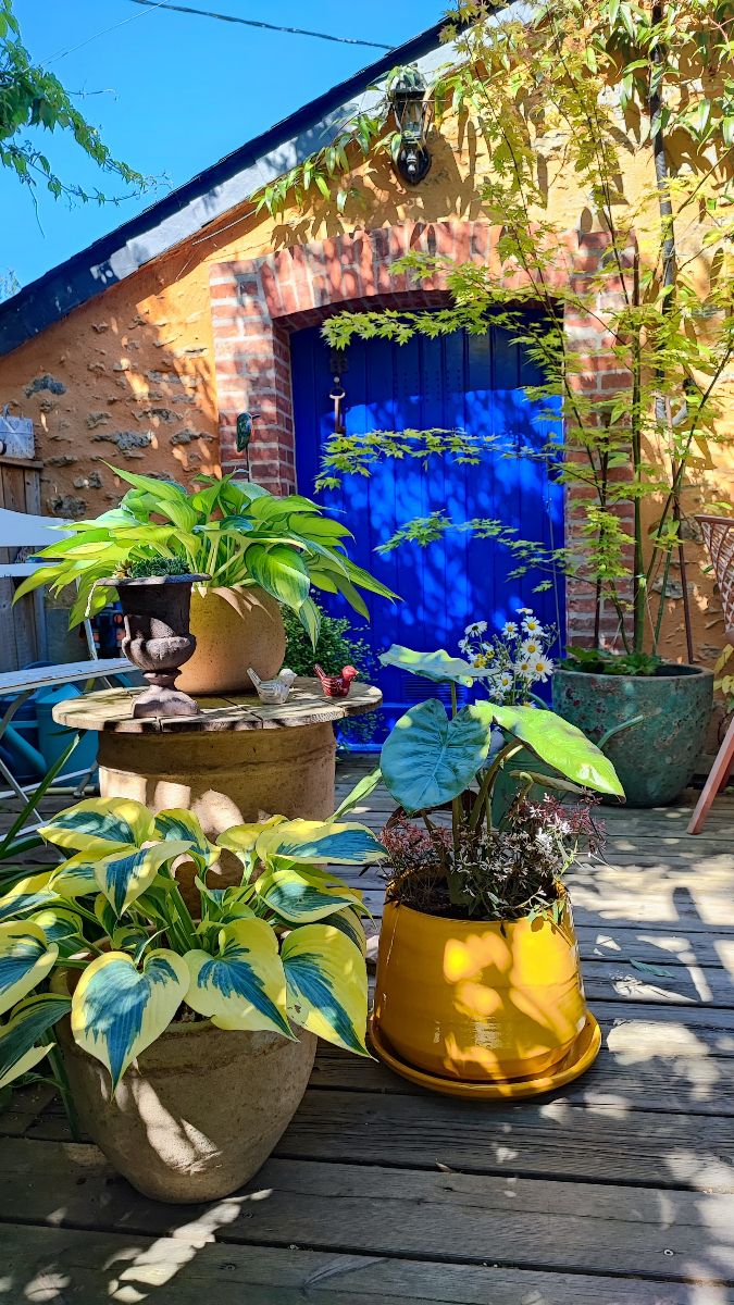 Denis e Olivier vi accolgono nella loro casa in pietra in fondo al giardino di fiori, nella Sala Azzurra.