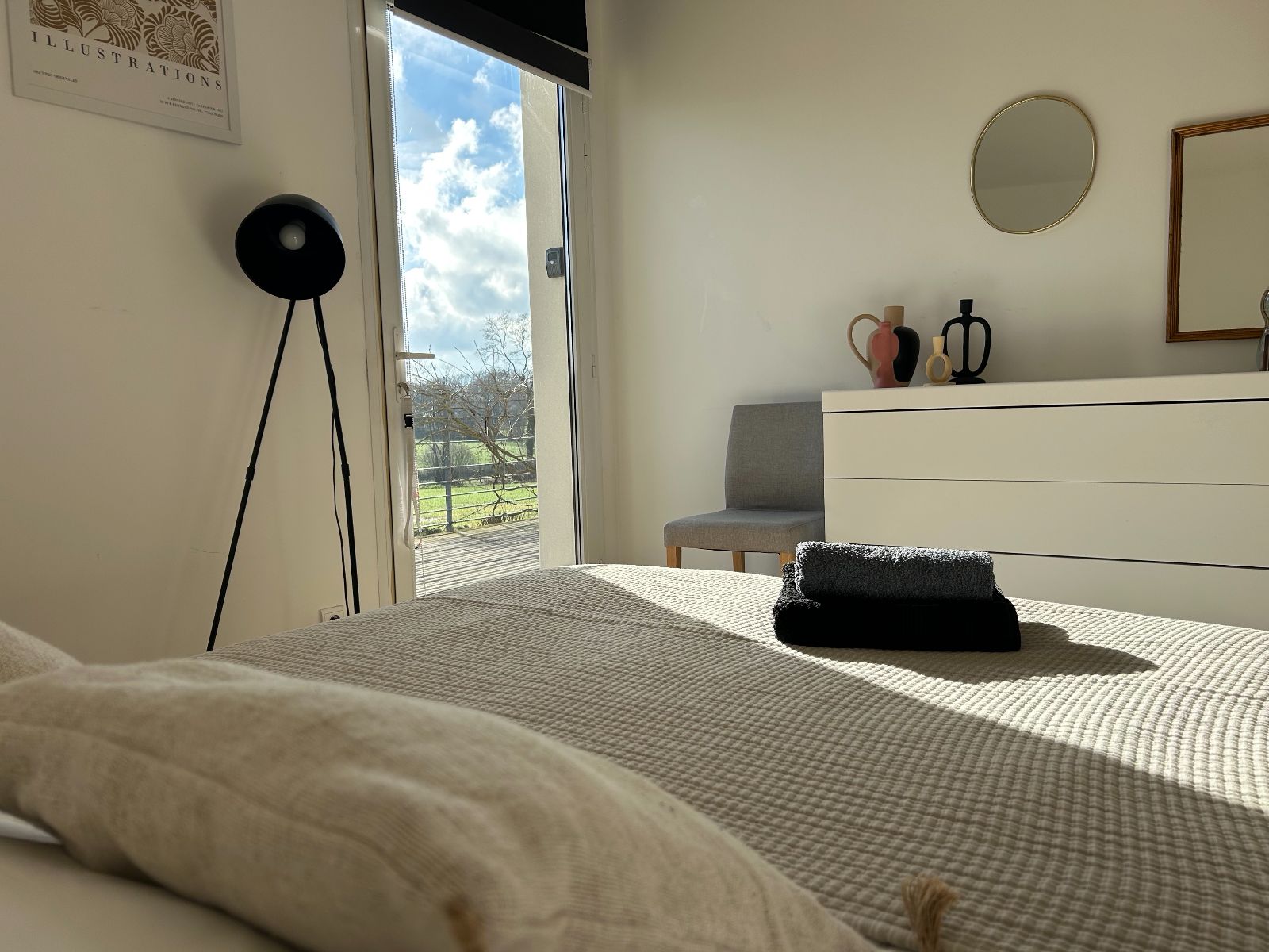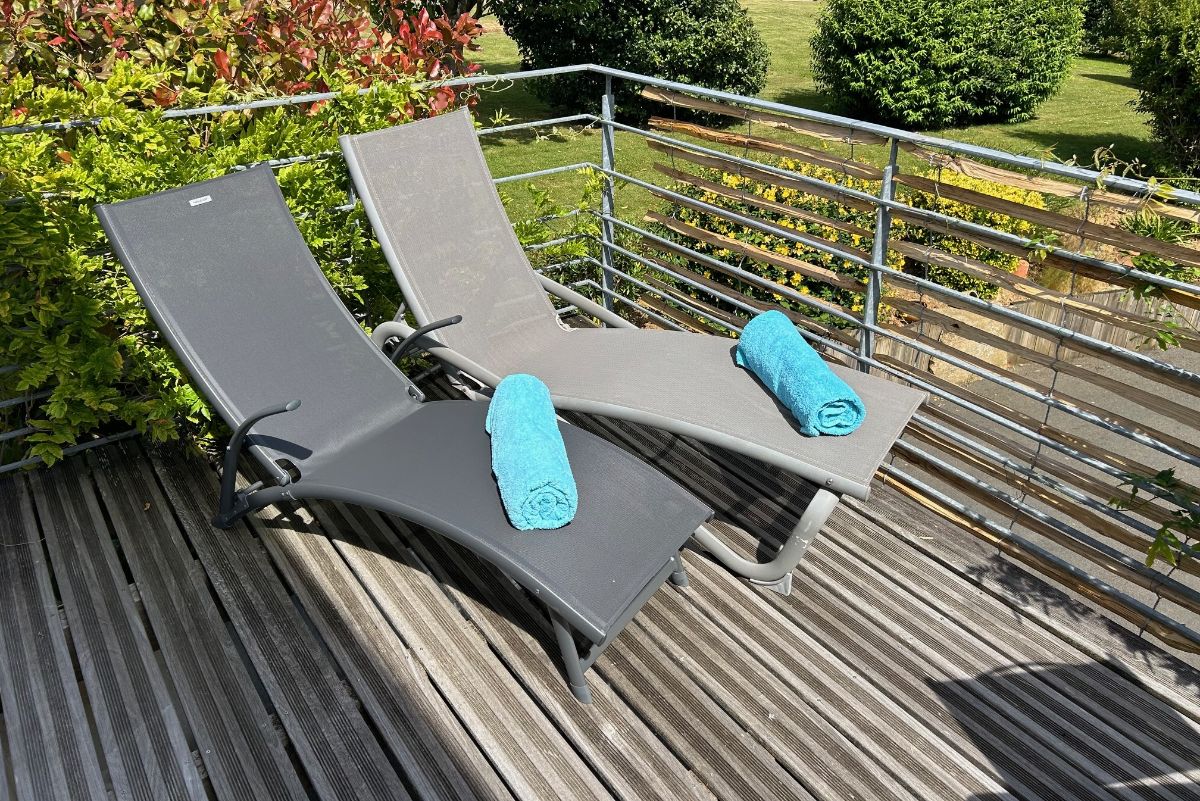 Das Zimmer öffnet sich direkt auf eine Sonnenterrasse mit freiem Blick über die Landschaft. Ein Garten mit Rasen ist für Besucher zugänglich.
