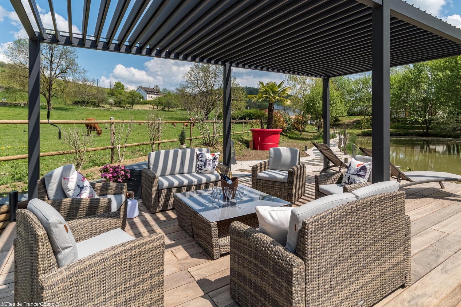 Eine Terrasse mit Gartenmöbeln, Gasplancha.