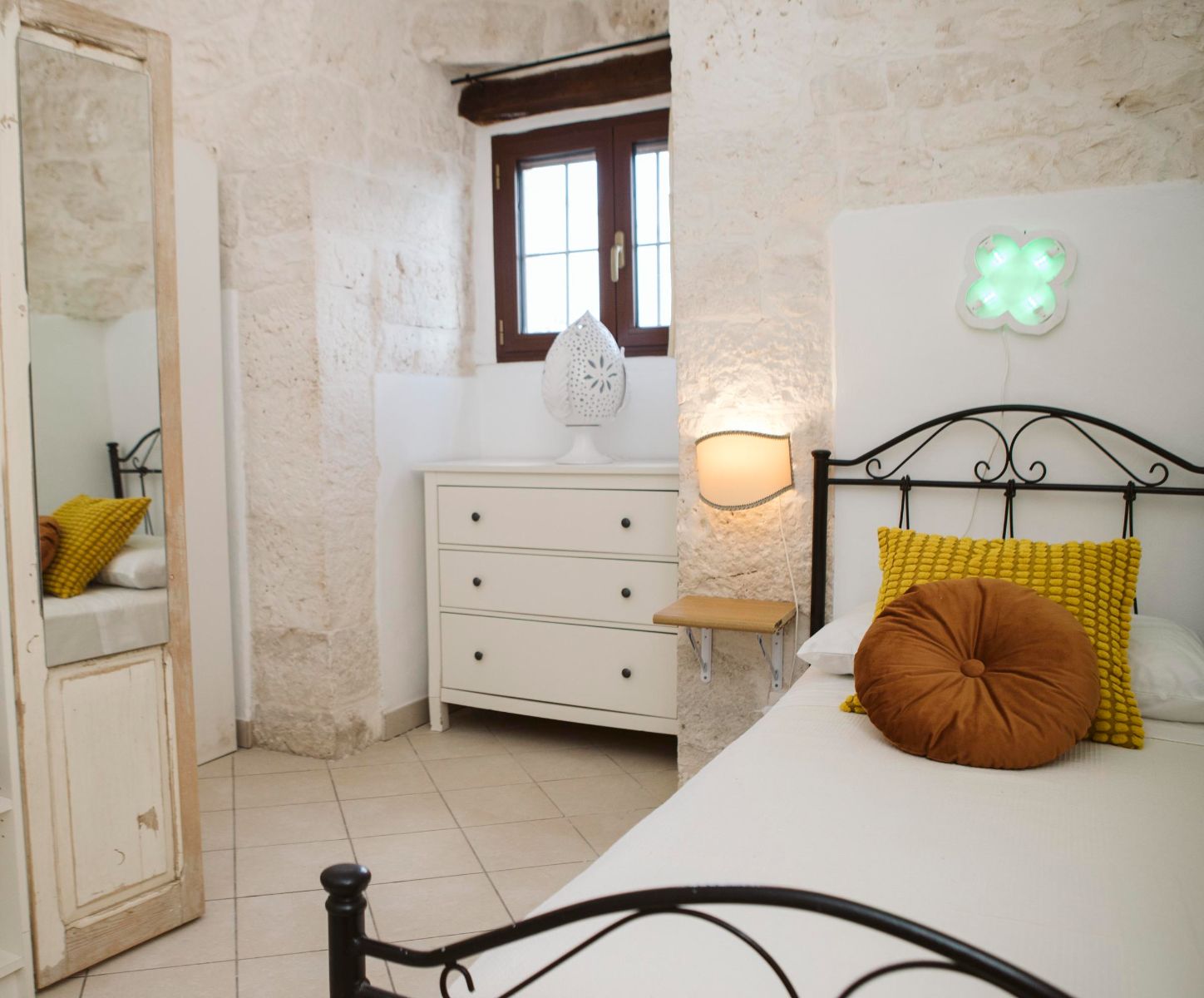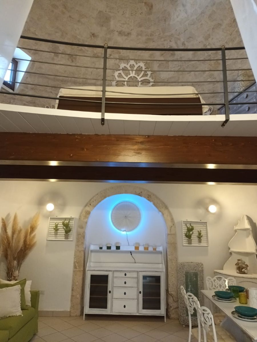 Die PUMI TRULLI bestehen aus einem riesigen Trullo von etwa 13 Metern Höhe, in dessen Inneren sich der gesellige Raum mit antiken Tischen und Bänken, Fernseher, Kleiderschrank und Doppelschlafsofa befindet. Von hier aus gelangt man über eine Treppe in den oberen Bereich, wo sich ein bequemes Doppelbett befindet. Von diesem Raum aus gelangen Sie in den anderen Trullo mit zwei Einzelbetten und daneben finden Sie die Küche, die mit allem ausgestattet ist, was Sie für Ihren Aufenthalt benötigen, sowie das Badezimmer mit Dusche und Waschmaschine.