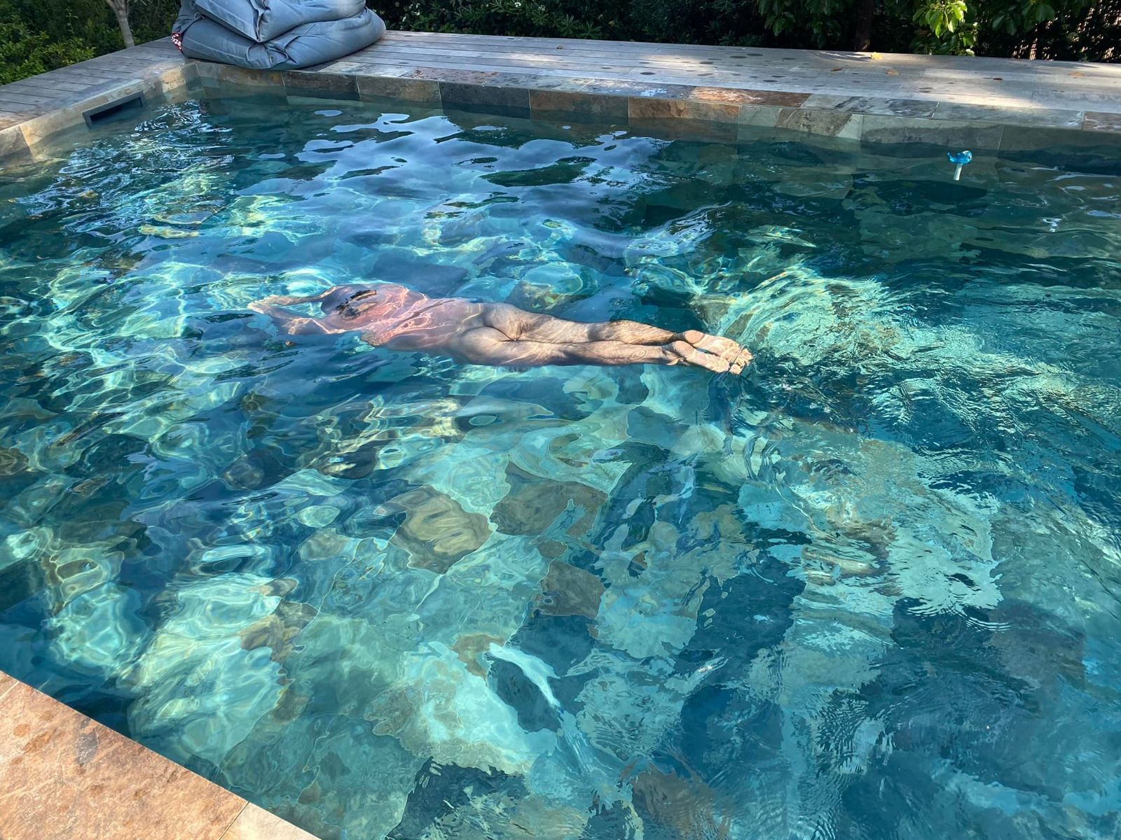Alle Öffnungen blicken auf den Garten, den Sie genießen können. Auf der Terrasse mit Gartenmöbeln können Sie sich sonnen, einen Aperitif oder eine Mahlzeit im Schatten der Kiefer genießen. Sie haben auch Zugang zum Pool der Villa und zum Strand. FKK ist willkommen und wird dort regelmäßig praktiziert, ohne dass dies vorgeschrieben ist.