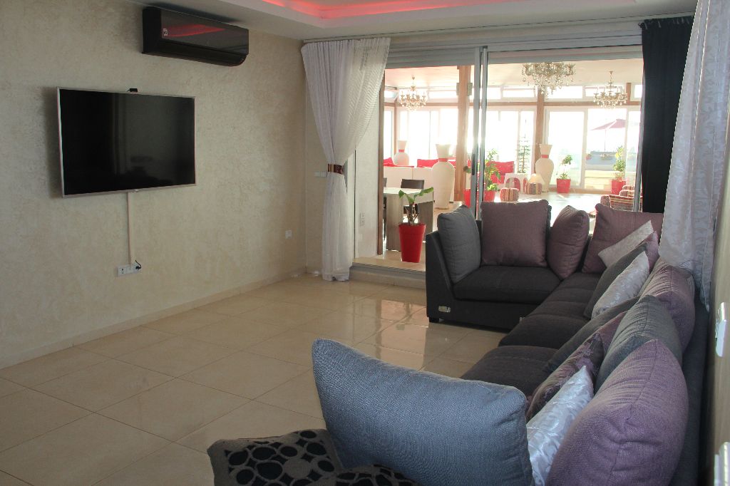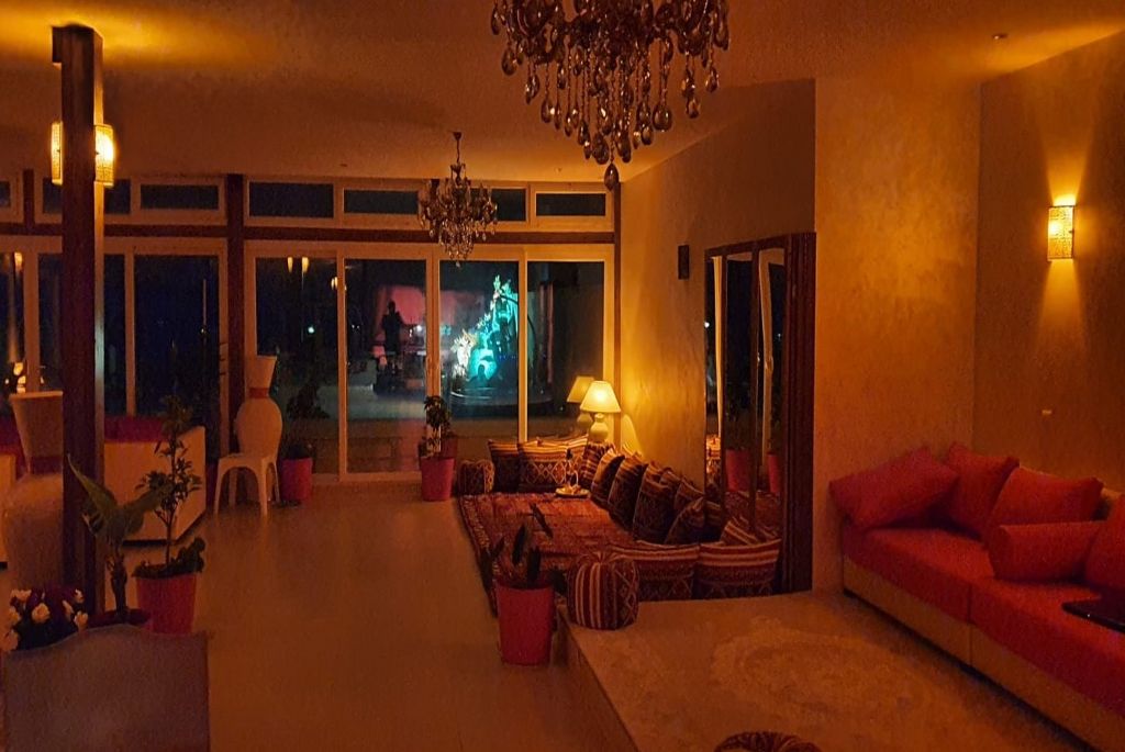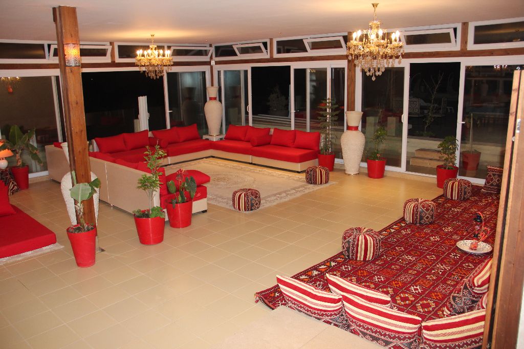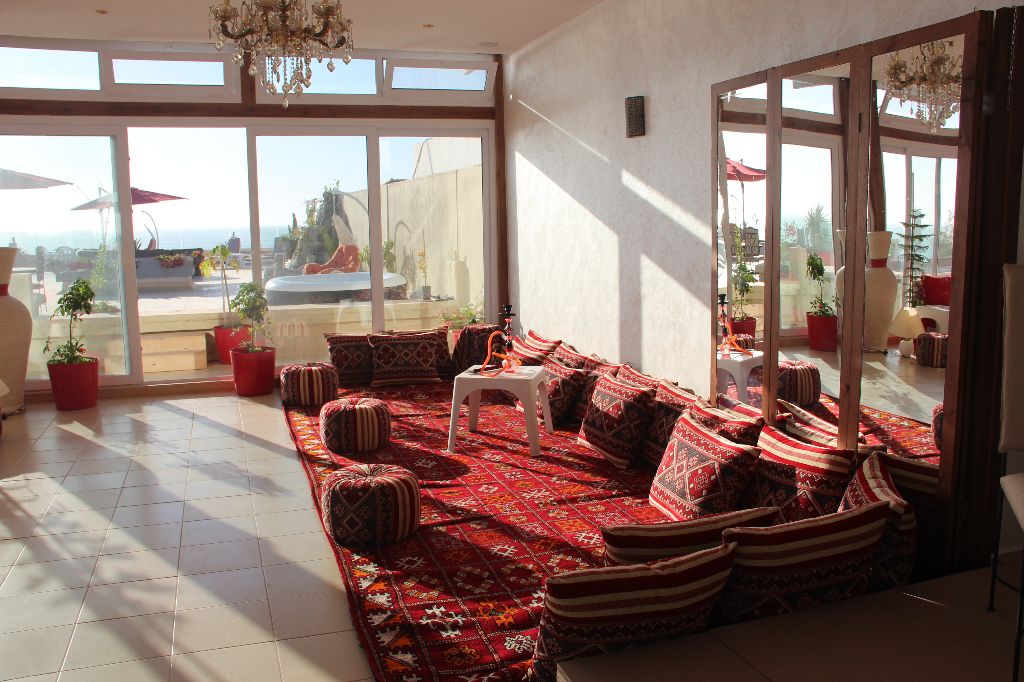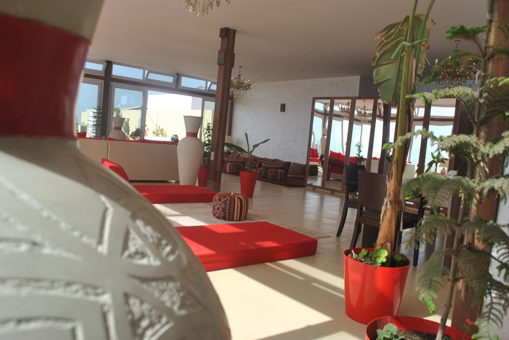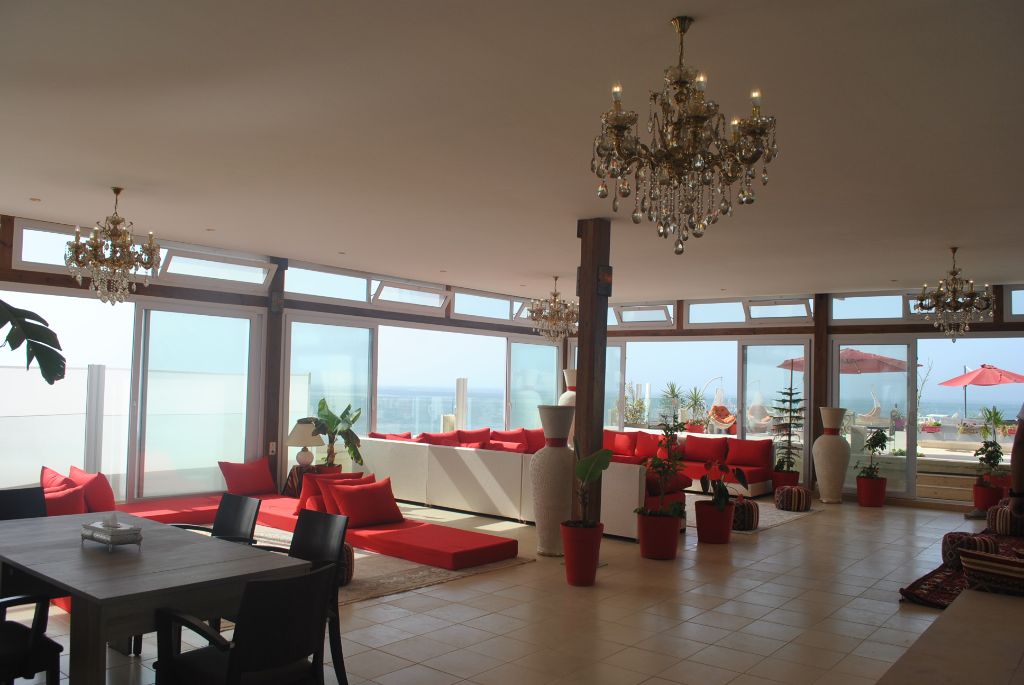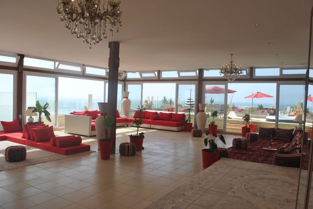 The huge living room of 150m², organized in the Moroccan style, it is permanently ventilated by skylights all around the room, with its dining area, its 4 large relaxation areas awaits you, all facing the sea: