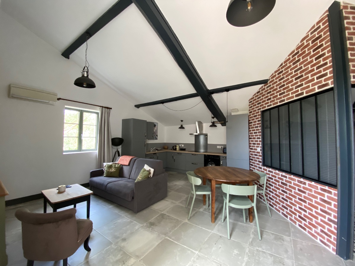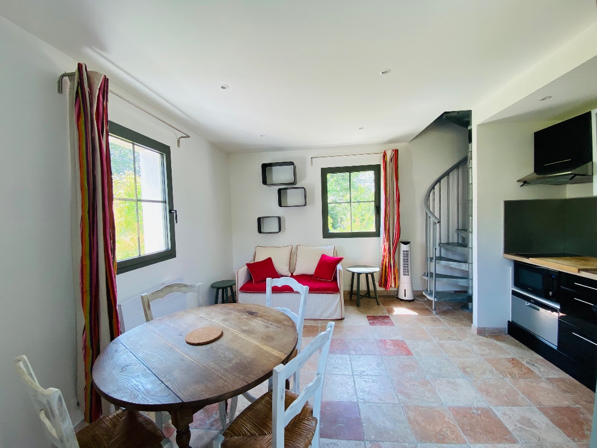 LE PIGEONNIER: For 2 people, open living room/kitchen. Bedroom, shower room and toilet upstairs. Air-conditioned. Television, new bedding in 160 x 200 of hotel quality. Private terrace facing South / South East with gas griddle.