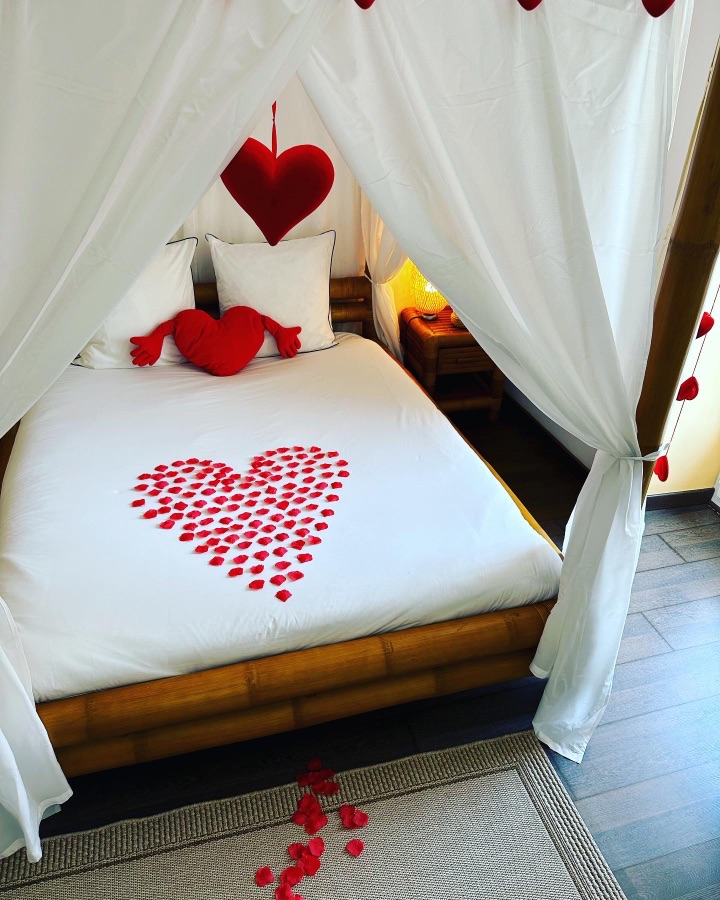 Enjoy a comfortable room with a four-poster bed, it is possible to add the romantic option (+ 19 € rose petals and candles)