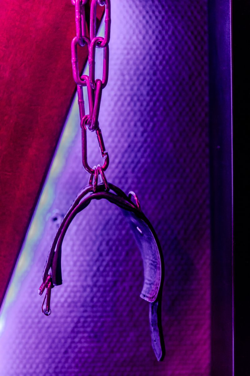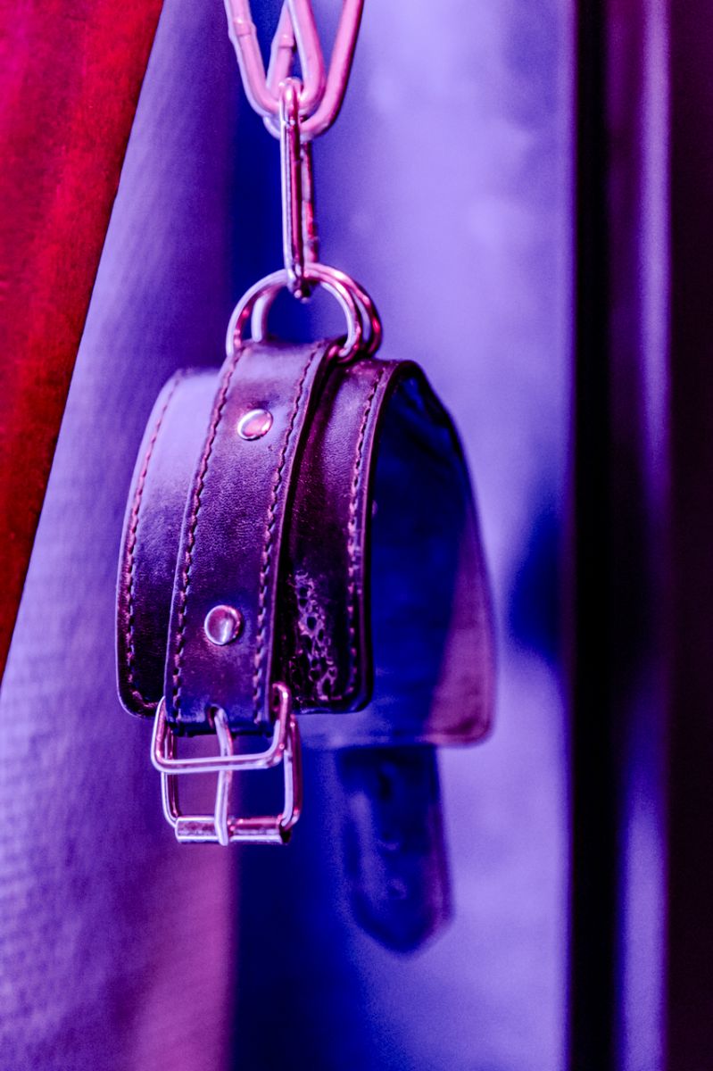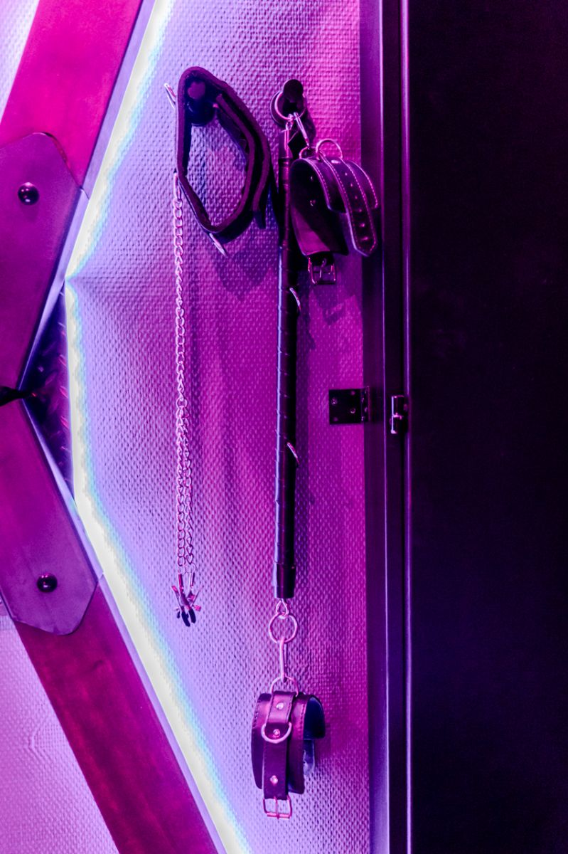 The room equipped with a cross of Saint Andrew attached to the wall with handcuffs for arms and legs, a collar and a leash of domination, a whip, clamps for nipples, a blindfold and a rope of bondage.