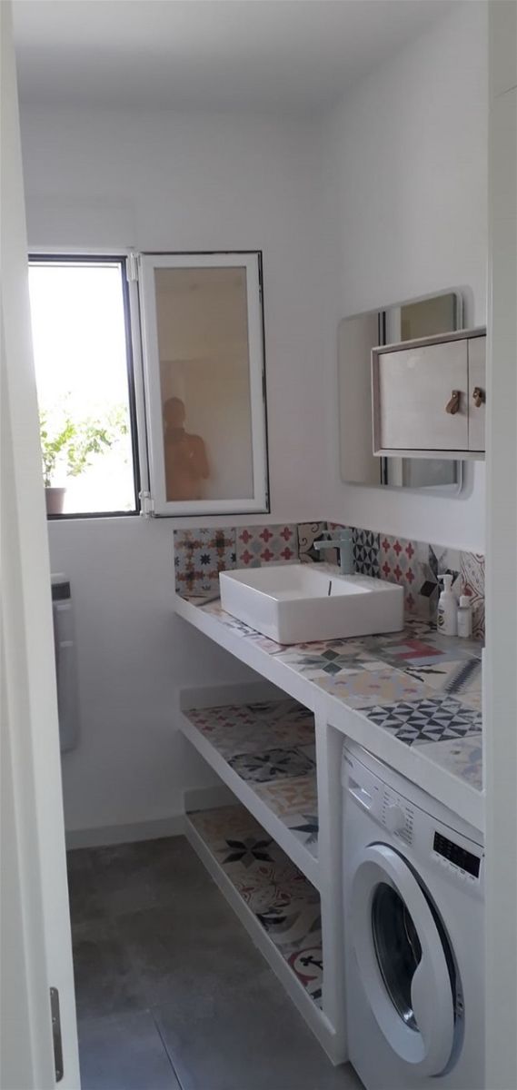 The bathroom is made of a large spacious shower, a large sink, a cupboard, a washing machine, toilets.