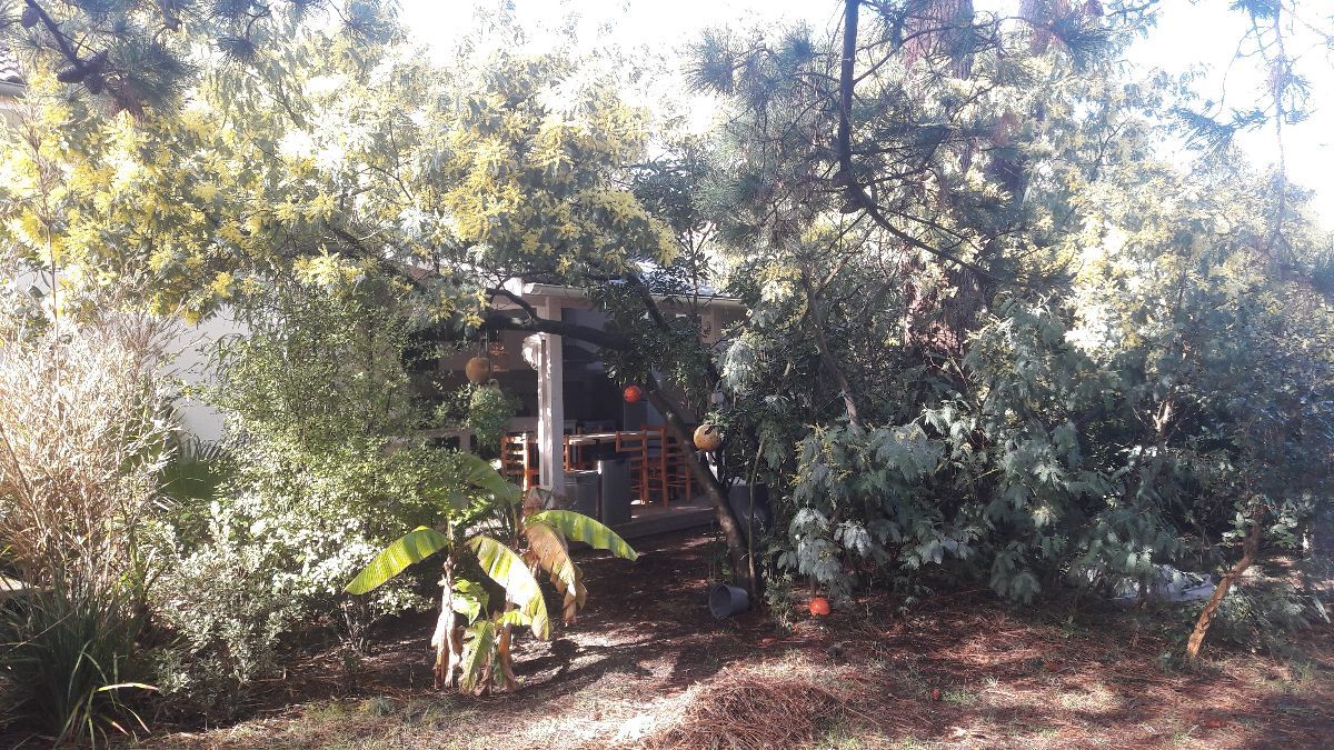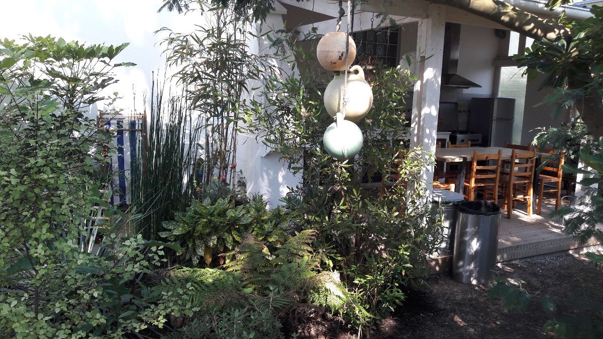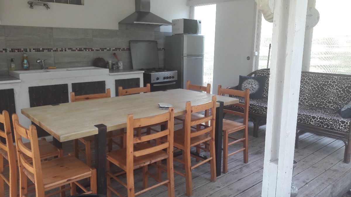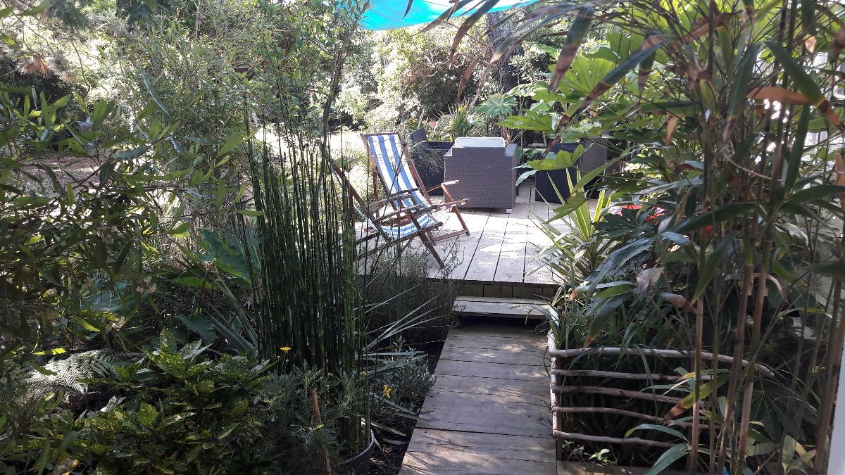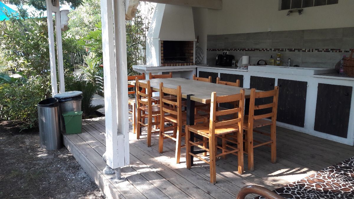 Large, fully equipped summer kitchen (fridge, microwave, gas stove, kitchen utensils), spacious and comfortable, available for guests, opening onto a solarium terrace, with lounge and deck chairs, around a plant area.