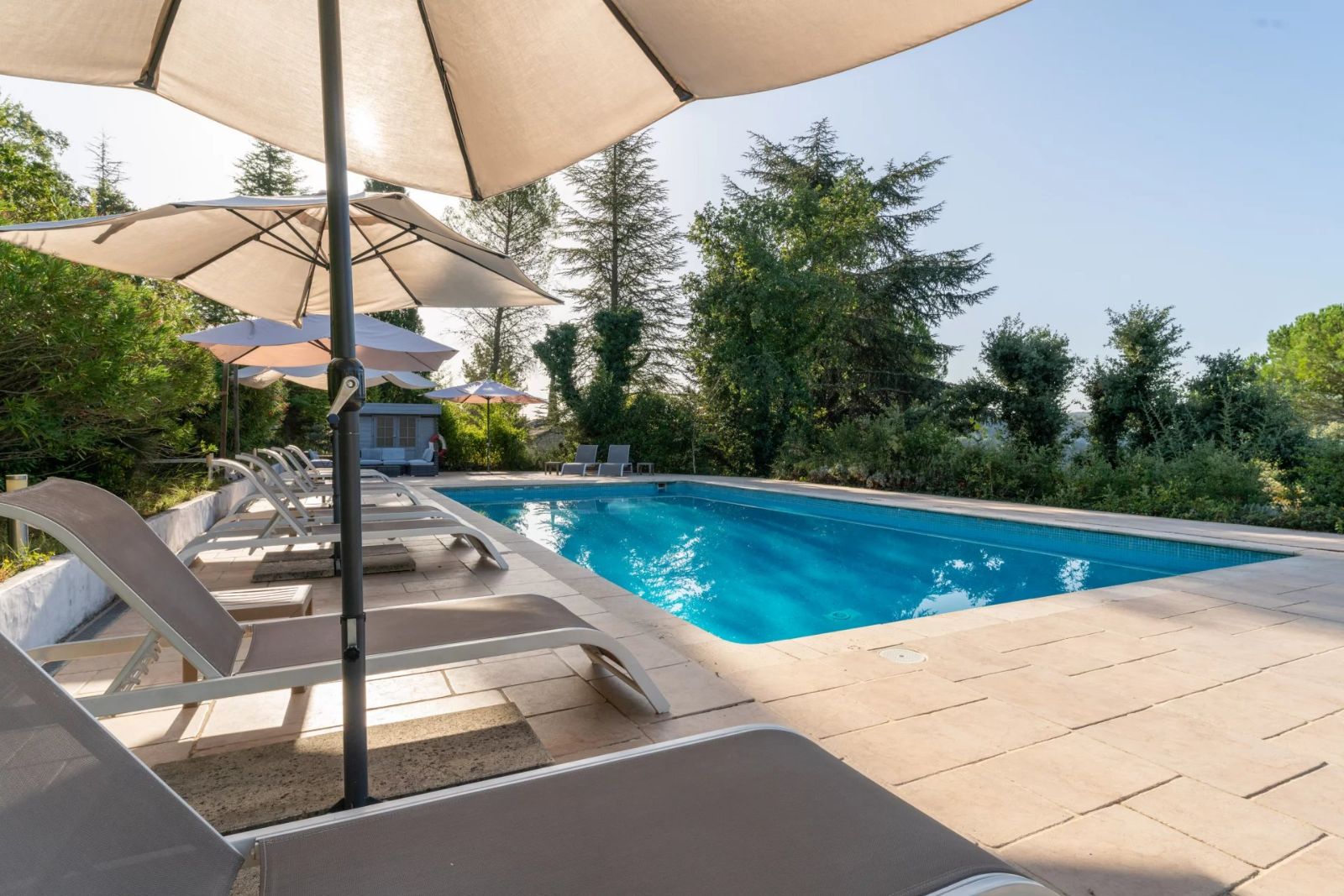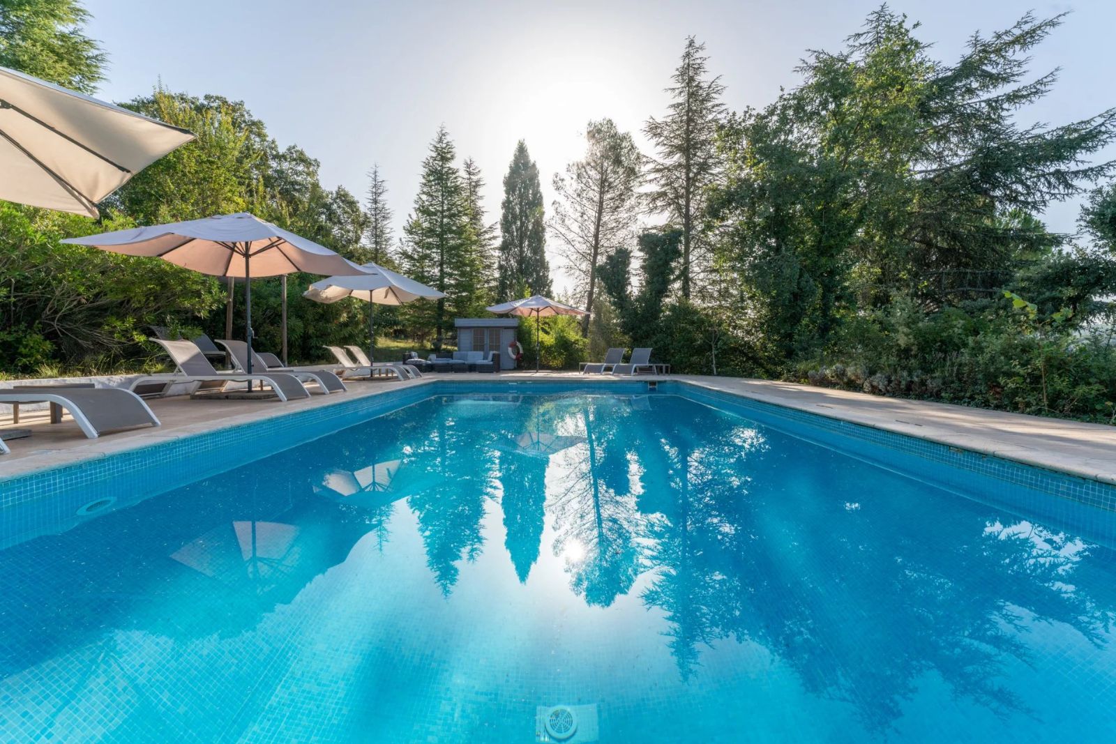 - Large private pool: The property boasts an unusually large, heated pool, measuring 12m in length, 6m in width and with a depth 3m at its deep end. Surrounded by tall evergreen trees, its secluded location has allowed for clothing-optional sunbathing and swimming since the business first opened in 2001.