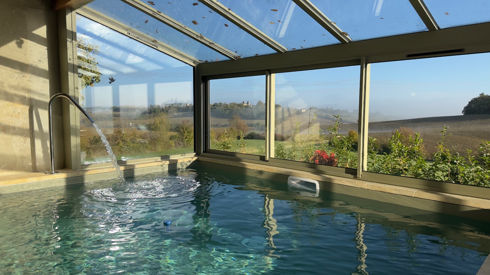 The space opens onto the Gers countryside with a view of the Pyrenees mountain range, the village of Terraube and its castle, and depending on the season, can preserve its gentle warmth in a cocooning space while maintaining this inside/outside impression.