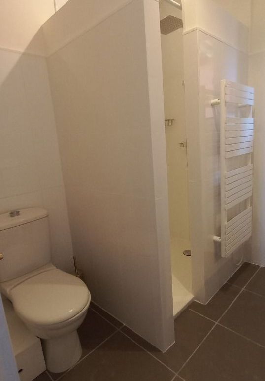 A bathroom with WC / large shower / washbasin / cupboards and cleaning closet.