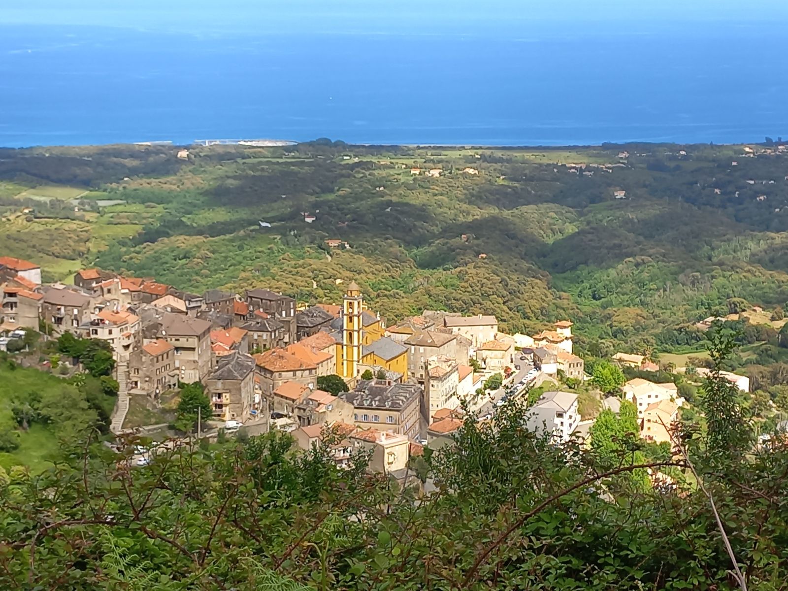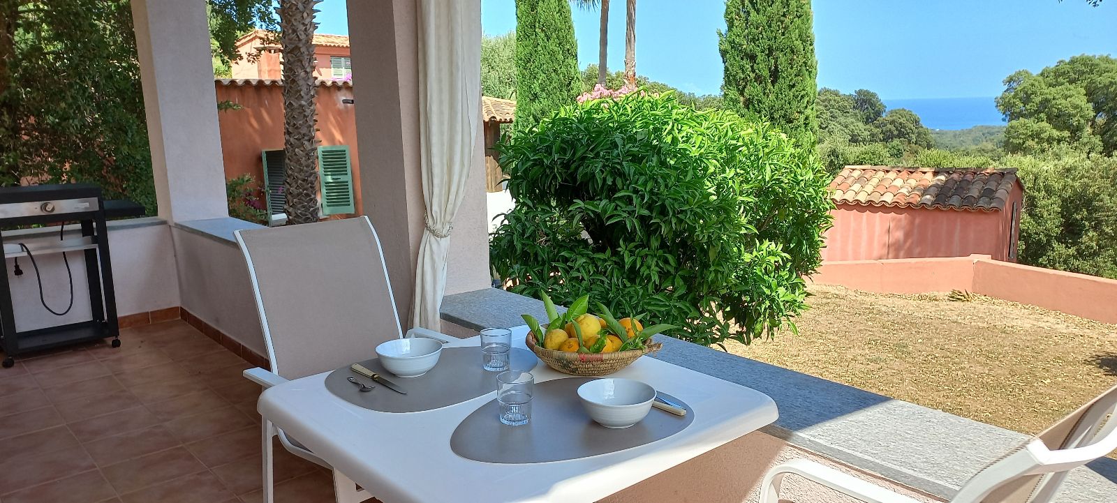 An east-facing terrace with an open view over the forest and the Tyrrhenian Sea, equipped with a table, two chairs and an electric plancha grill.