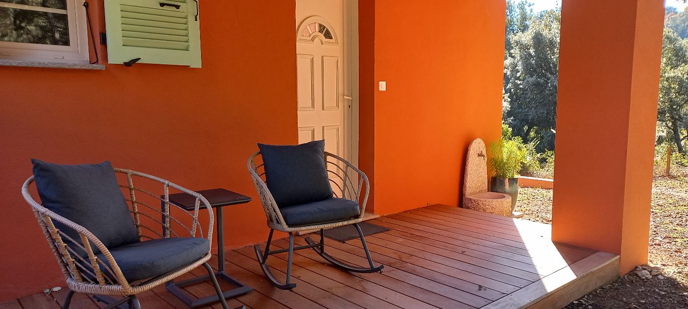 A terrace on the mountain side to enjoy the shade of the cork oaks and holm oaks, equipped with two rocking chairs.