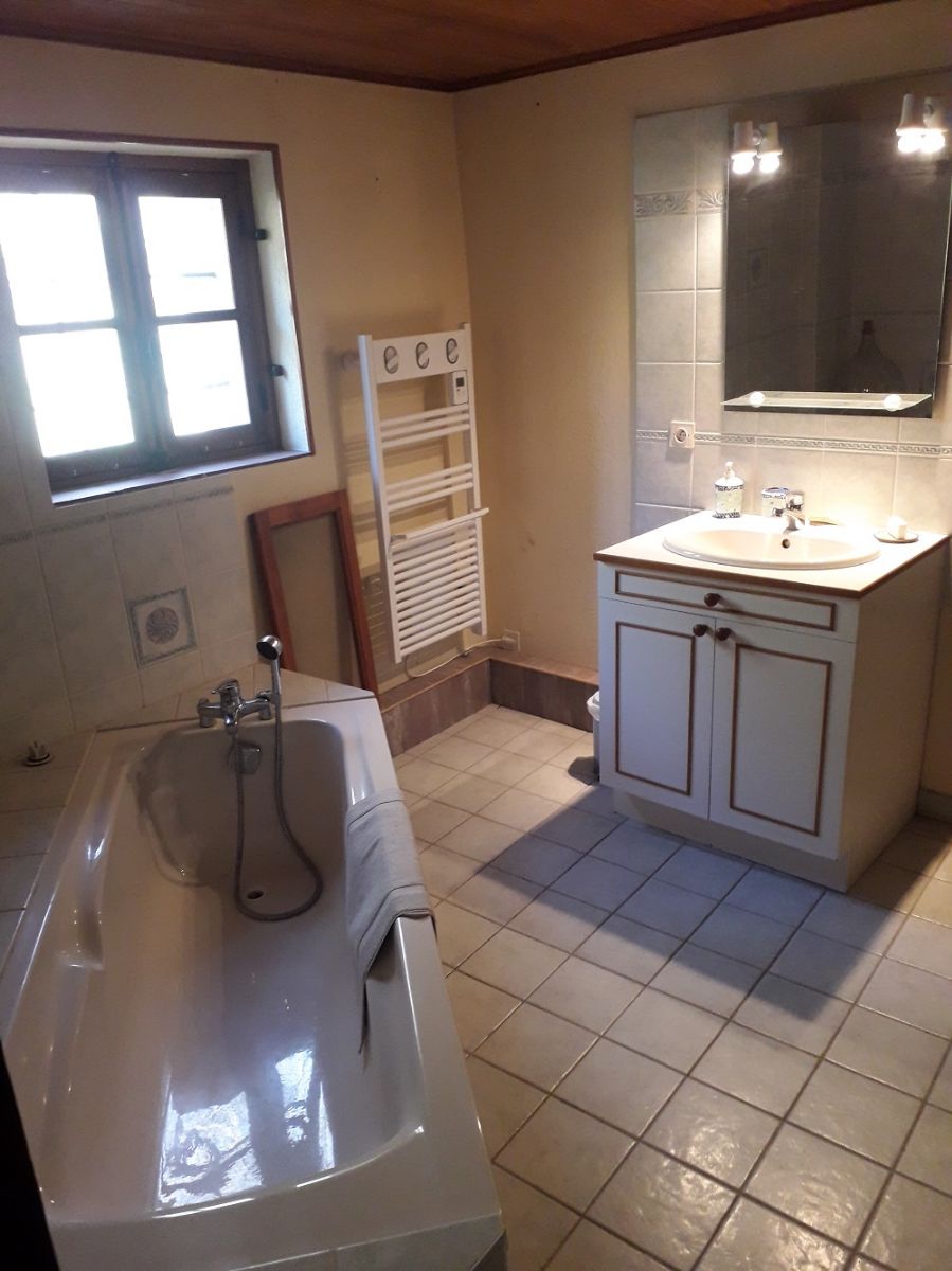 It features a 24 m² living room with old-world charm, a sofa bed opening onto the terrace, and a separate kitchen with all modern comforts. Upstairs there are 2 bedrooms: one 13 m² with a 140 cm bed, and the other 12 m² with a 160 cm bed or two 80 cm beds, a large bathroom with a bathtub, and a separate toilet.