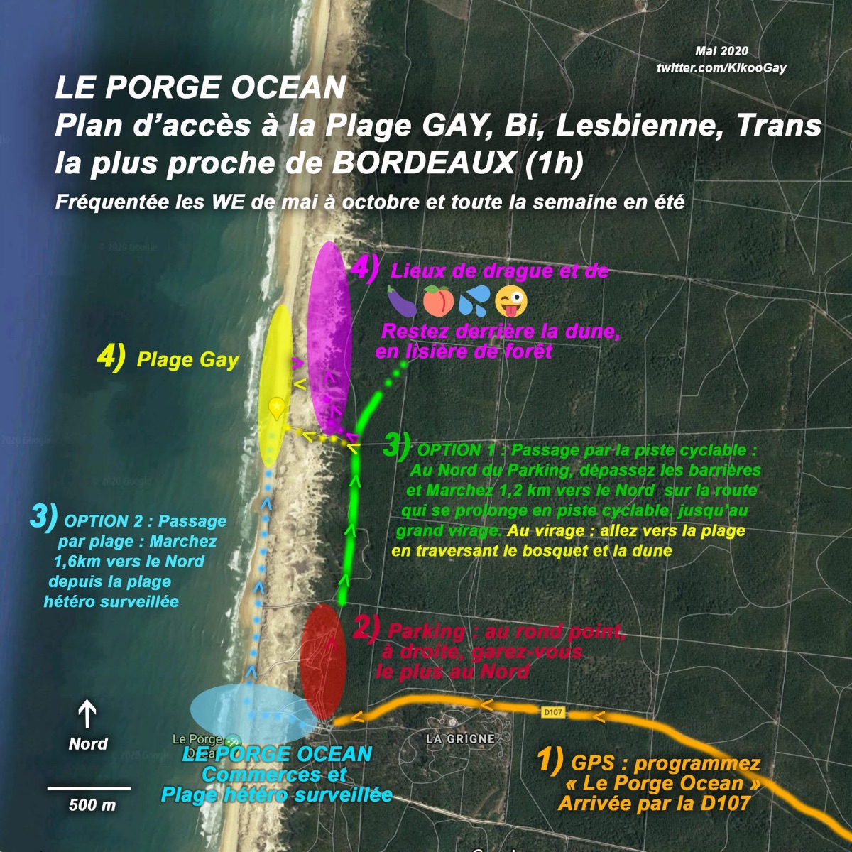 Le Porge Océan est connu pour être la plage la plus proche de Bordeaux. Elle est immense et magnifique. La plage Gay est 1,5 km au Nord de la plage normale principale ("hétéro"). Elle est très fréquenté de mai à octobre, surtout les week-end de beau temps. Sur la plage gay en elle-même, pas mal de bordelais ou de vacanciers lgbt bronzent au soleil. Ensuite, derrière les dunes, en lisière de Forêt, les mecs s'adonnent parfois à la drague / au cruising.