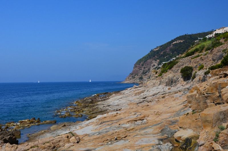 Très belle et vaste plage de rochers à proximité de Carqueiranne. La plage est constituée de gros galets. Paysage lunaire. Naturisme autorisé.