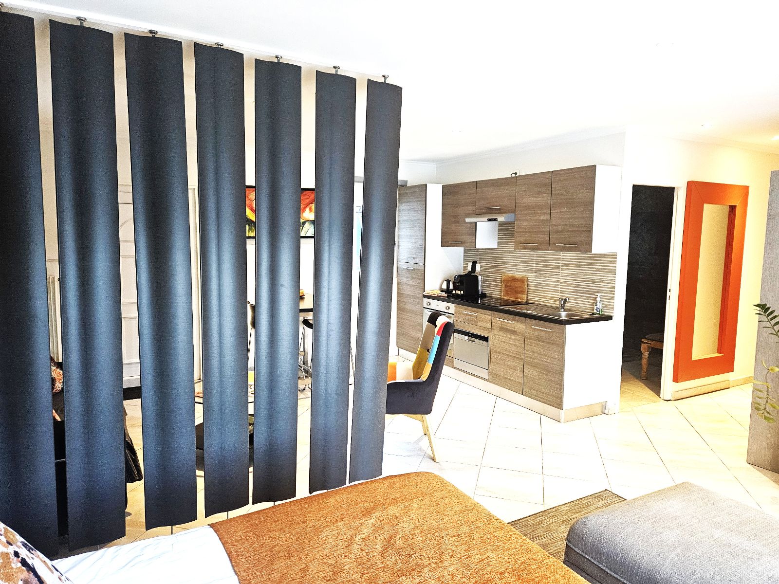 -a double living space with a "bedroom" side with QUEEN size bed (160 cm), 50 "flat screen TV and a fully equipped lounge / kitchen area (induction hob, extractor fan, dishwasher, oven, microwave , refrigerator, freezer, crockery, kitchen utensils, coffee maker, kettle, toaster, high table with 2 stools ...),