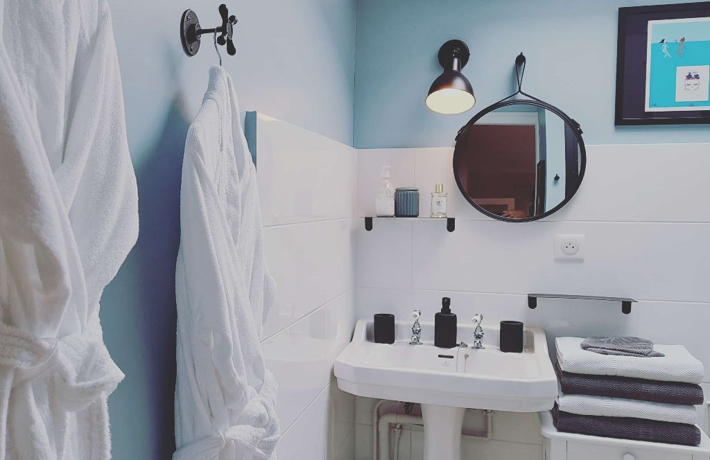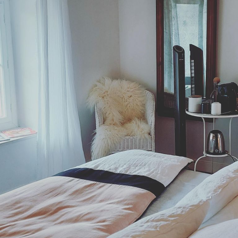 Todo en tonos de gris y rosa pastel, nuestra única cama y desayuno SoCosy se adorna con suavidad y lino lavado. Tiene una entrada independiente y se encuentra en el 1er piso de la casa.