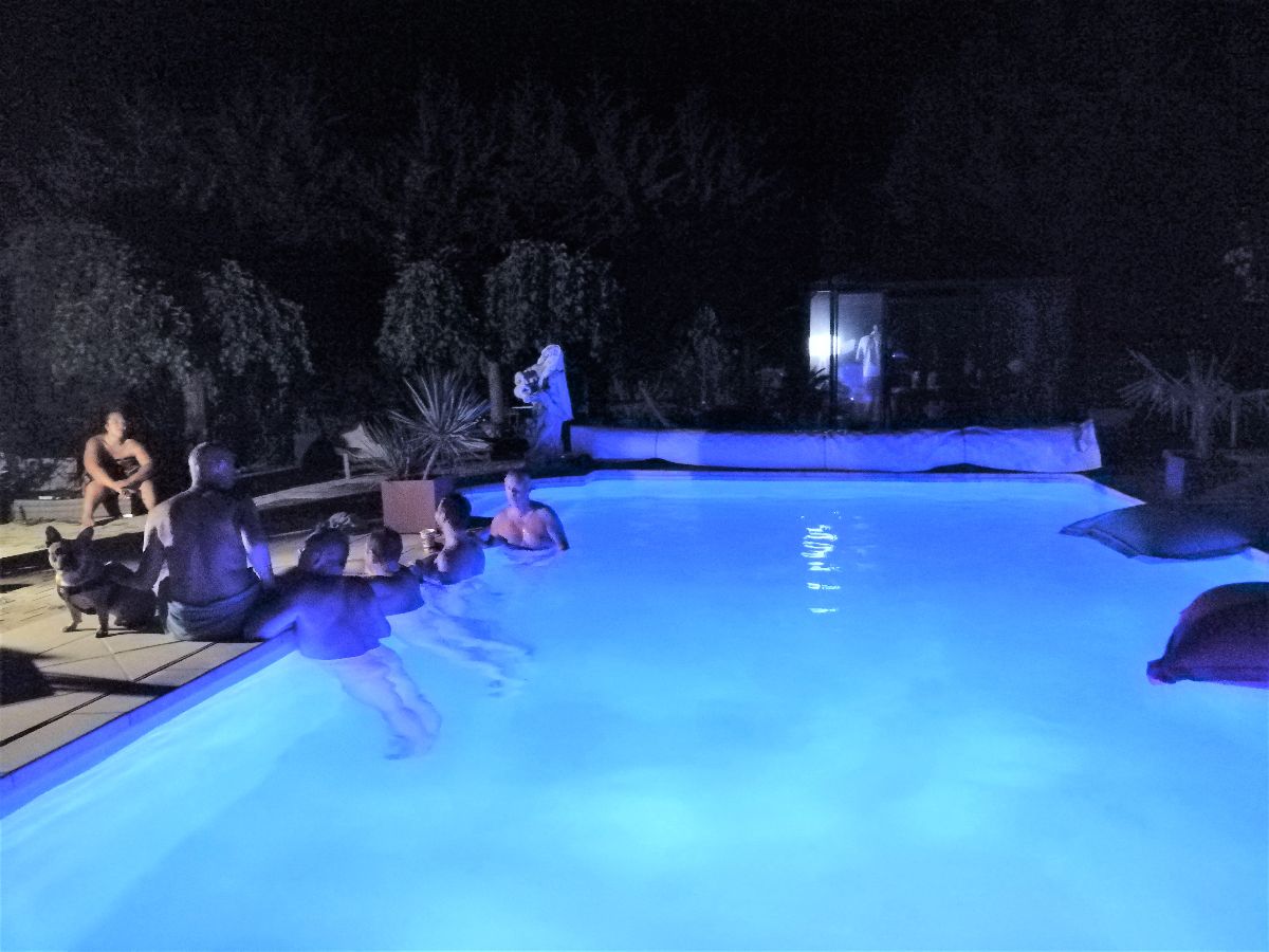La piscina con piscina contra la corriente y el jacuzzi, rodeada de pequeñas terrazas (naturismo posible). Se instalará una sauna en otoño.