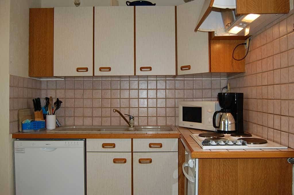 Salon avec coin cuisine, lave-vaisselle, four traditionnel