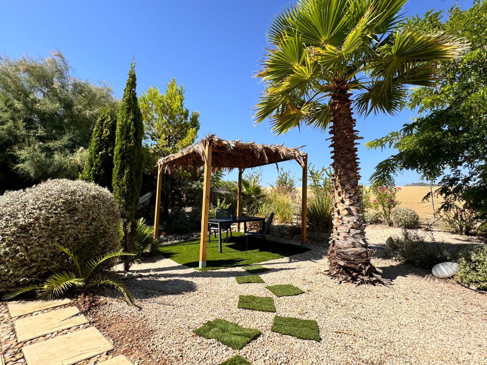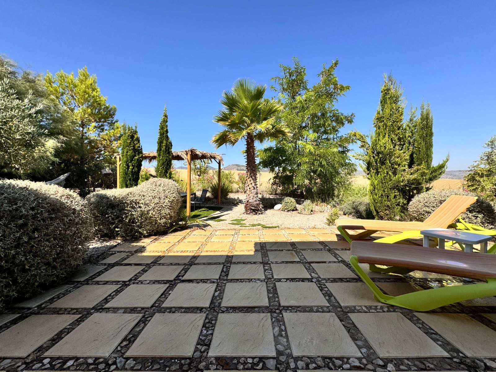 Terrasse privée, avec table, chaises & transats : vue sur la campagne & son jardin méditerranéen où vous assisterez à ses superbes couchers de soleil.