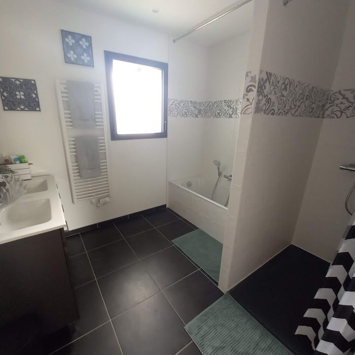 2 salles de bain partagées, une à l'étage (baignoire, douche et double vasque), et une autre au rdc (douche et lavabo simple) et deux WC indépendants (à l'étage et en RDC).