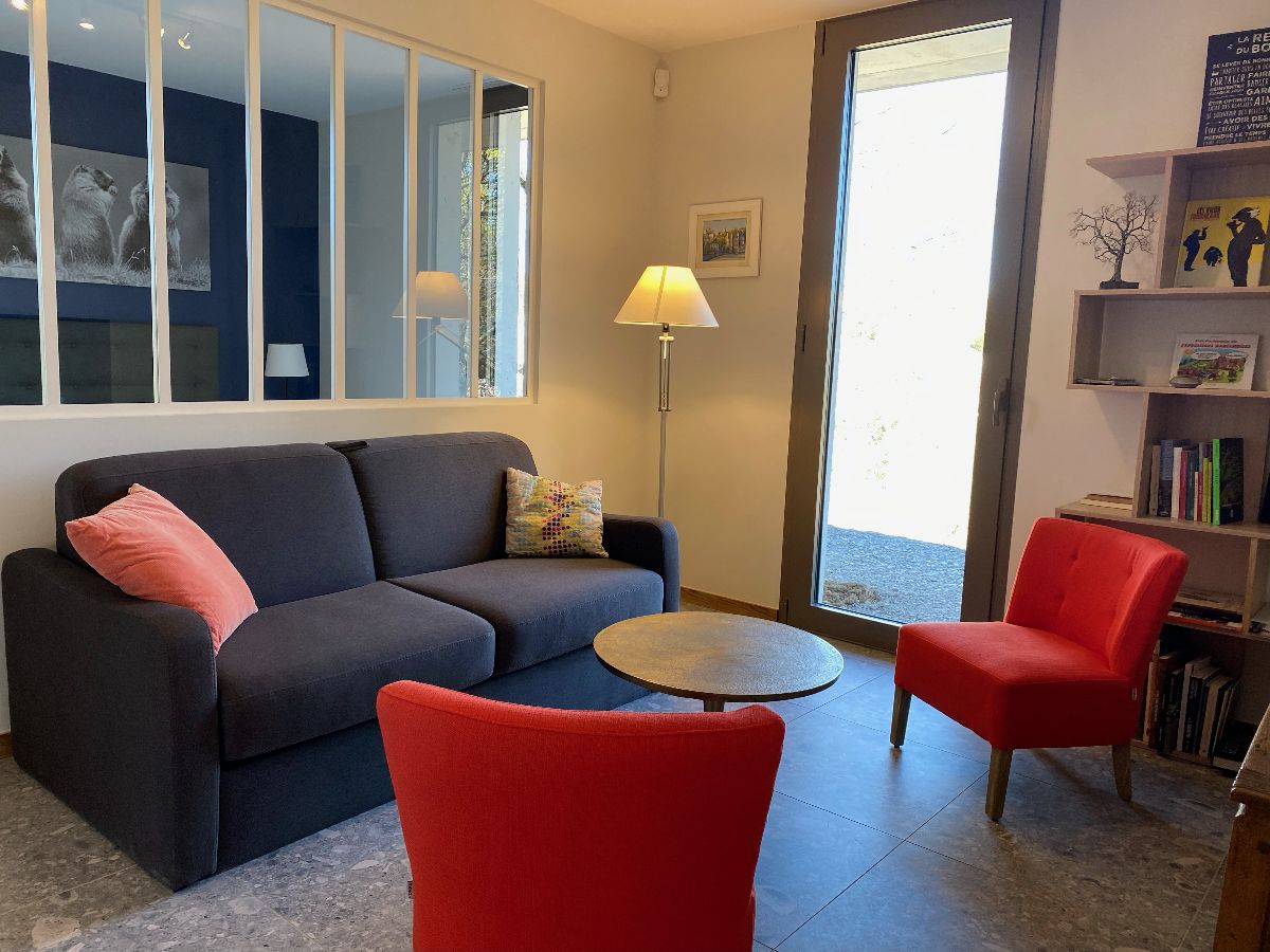 - d'une pièce de vie ouvrant sur une grande terrasse couverte, avec une cuisine tout équipée (plaque à induction, four, micro-onde, lave-vaisselle, machine Nespresso, réfrigérateur) et un espace repas, un coin salon avec un canapé, deux fauteuil, une télévision et un lecteur de DVD ;