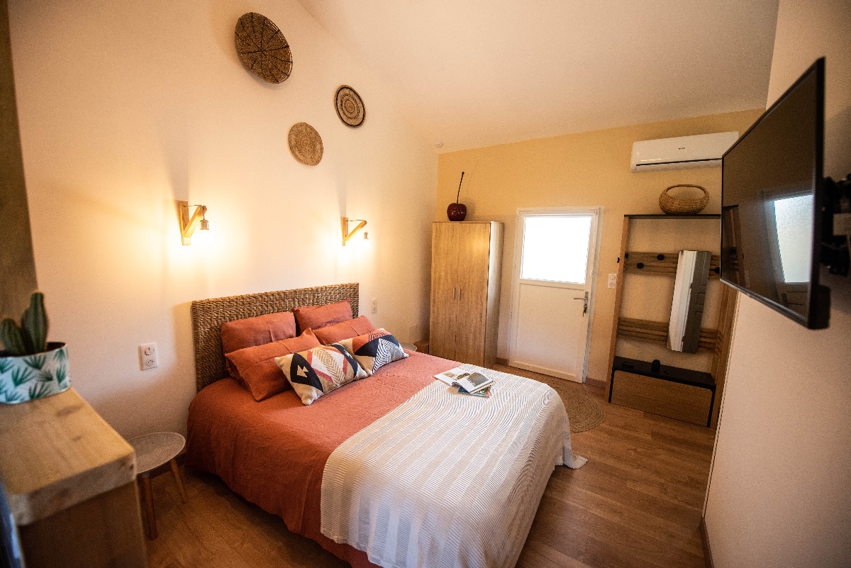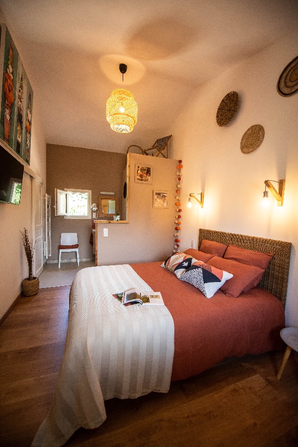 Notre chambre d'hôtes climatisée comporte un lit queen size, salle d'eau avec sa douche à l'italienne et wc, télévision avec mycanal et netflix, wifi , machine à café, bouilloire et pour votre confort un mini frigo.