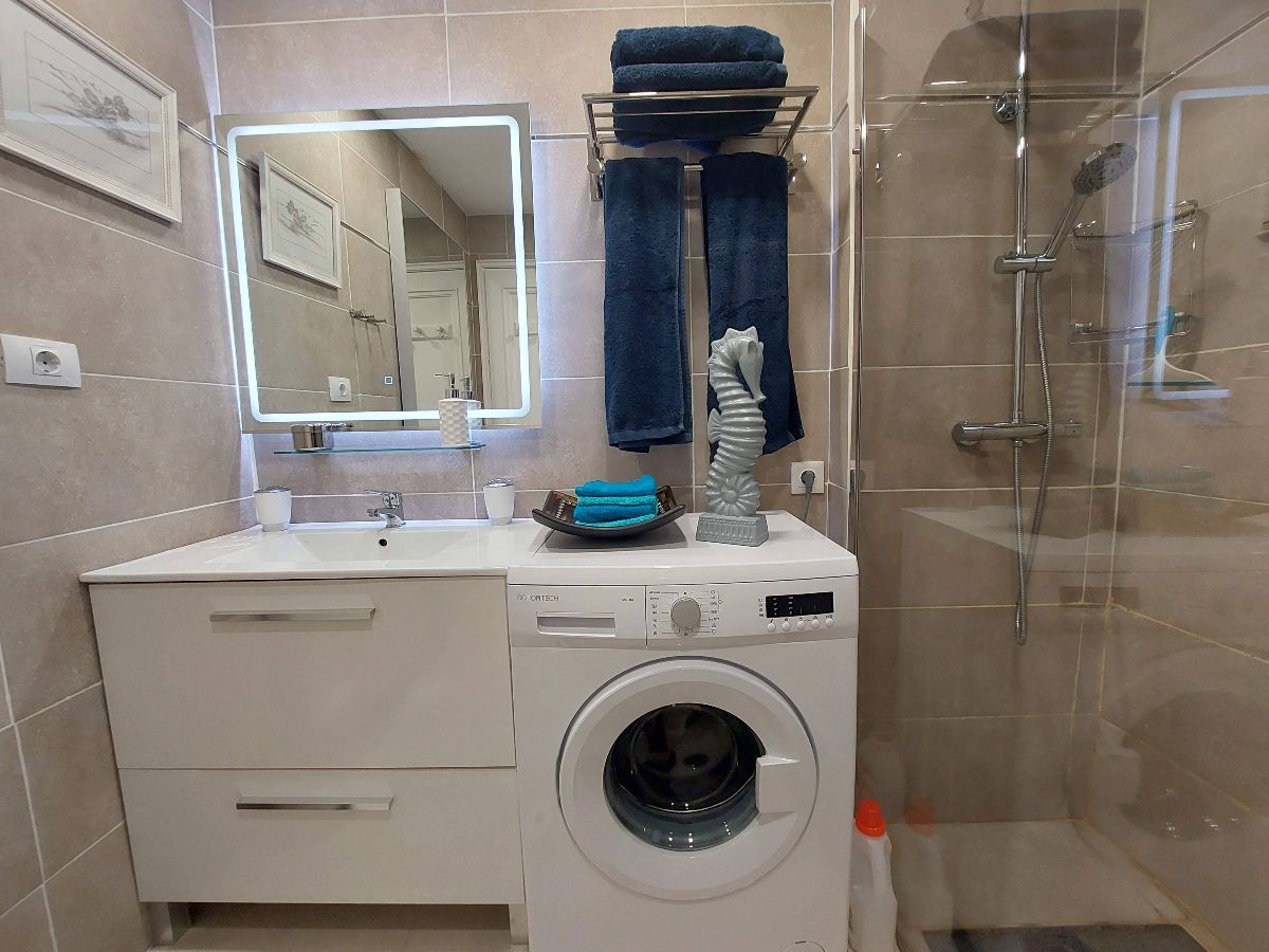 La salle de bains : une douche à l'italienne, lavabo, toilettes / un lave-linge