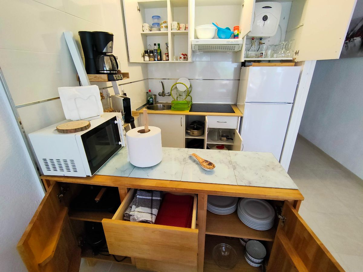 Le coin cuisine : un grand frigo / congélateur / une machine à café Nespresso, une bouilloire / un four/micro-ondes, un gril-pain / Quatres plaques à induction et différents équipements pour cuisiner