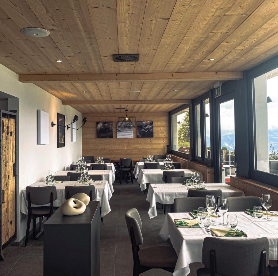 Une fois la porte franchie, vous découvrez un restaurant entièrement rénové avec de grandes baies vitrées pour profiter d’une vue à 180 sur les sommets alpins. Un cadre spacieux, ouvert et lumineux avec une décoration de style «chalet contemporain»