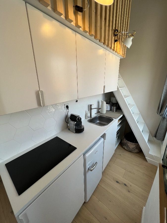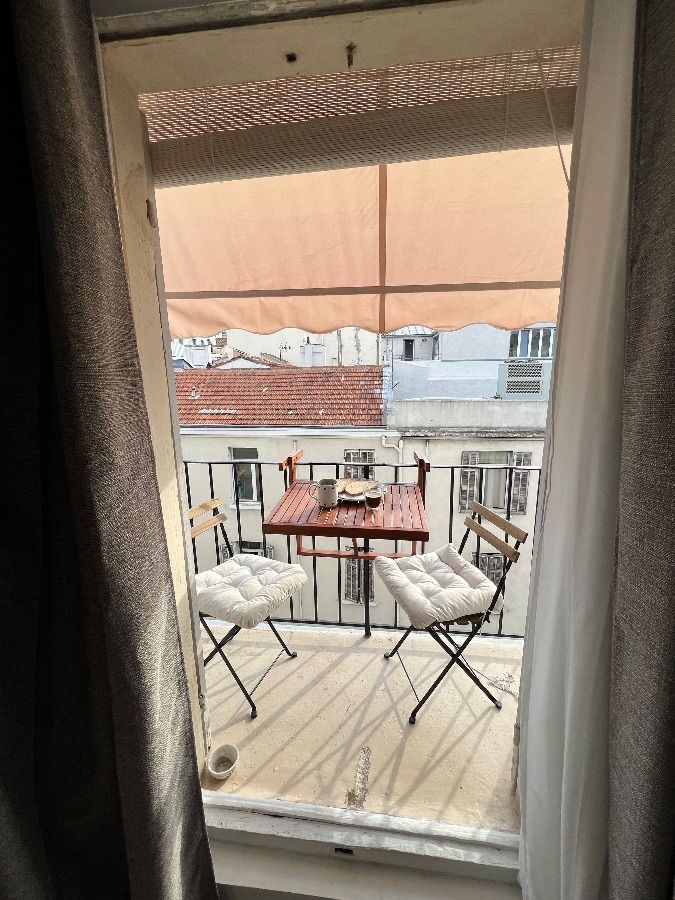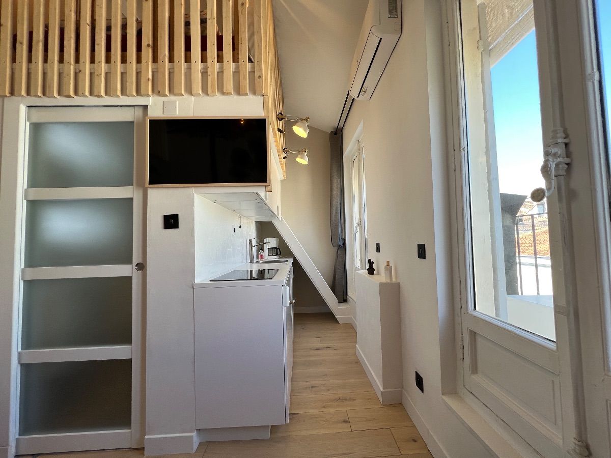 Ce logement rénové est la fusion de deux anciennes chambres de bonne avec son entrée indépendante dans un immeuble en pierre de taille et bénéficie d'un petit balcon tout confort avec clim.