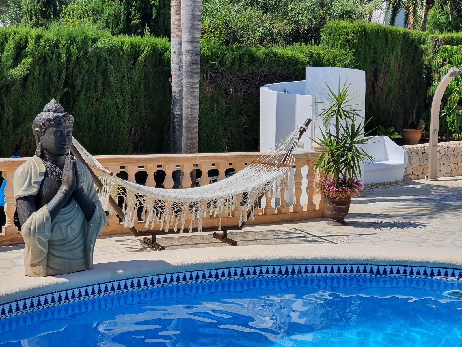 Le jardin tropical qui fleurit la plupart de l’année vous apporte ses senteurs méridionales et ses multiples espaces de repos et détente. Après quelques brasses dans la grande piscine mosaïque de 15m, par sa forme originale et sa cascade massante, son espace jacuzzi, et son Sauna, dés à présent vous pouvez vous relaxer. Les bains de soleil, les hamacs mexicains, le salon oriental, ou le lit piscine, sont à votre disposition pour une invitation aux voyages sous le soleil caliente de l’Espagne…