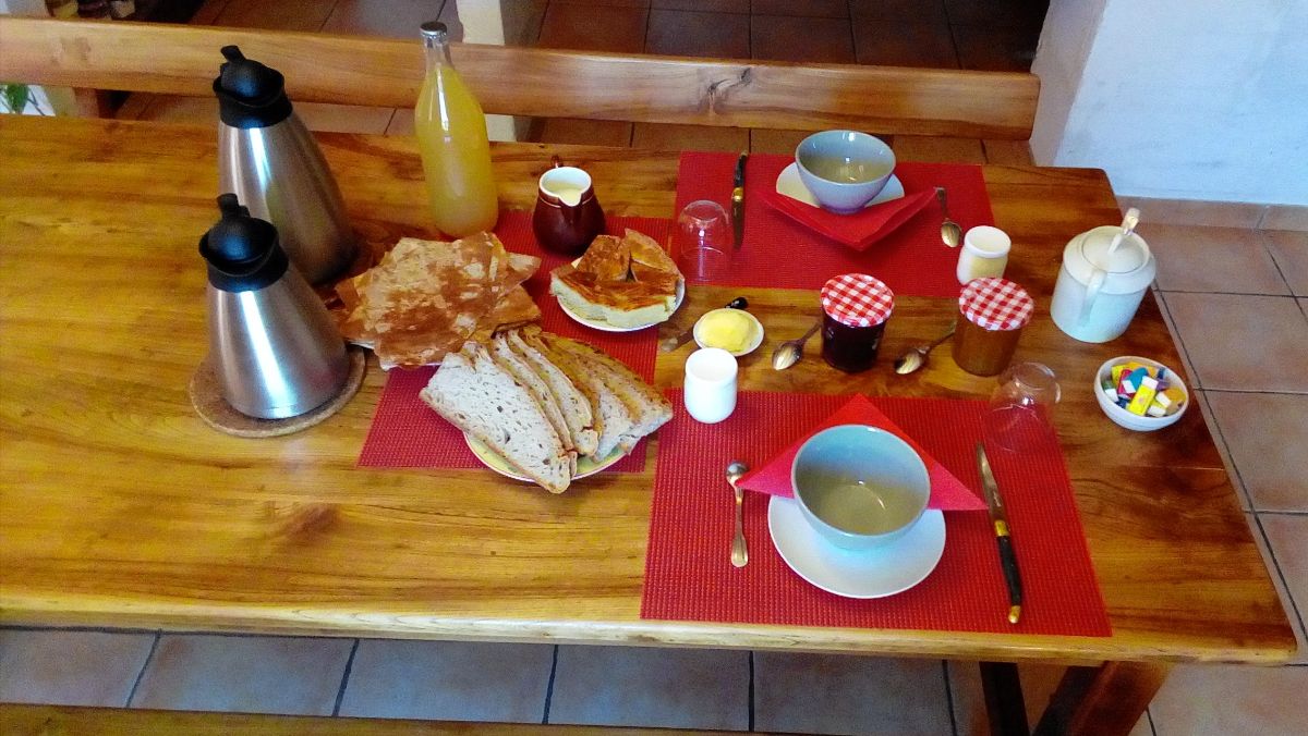 Le petit déjeuner, compris dans le prix, est servi dans notre pièce de vie avec gateau, crèpes, pain, confitures faits maison.Le soir, possibilité de table d'hote sur réservation, repas tout compris avec des produits locaux ou de notre production pour 22€ par pers.