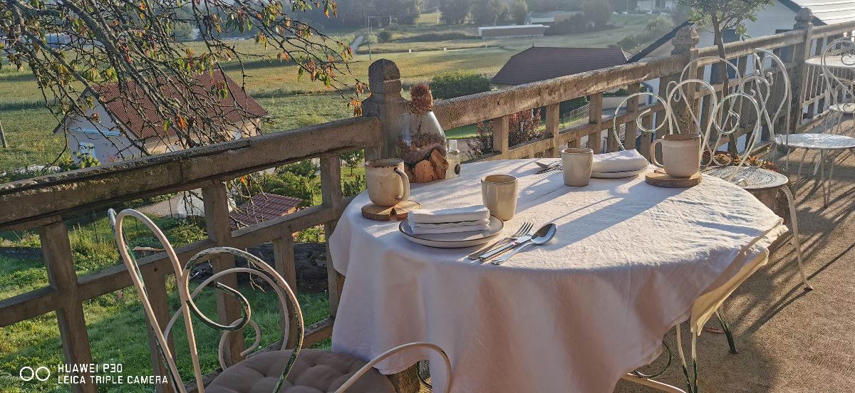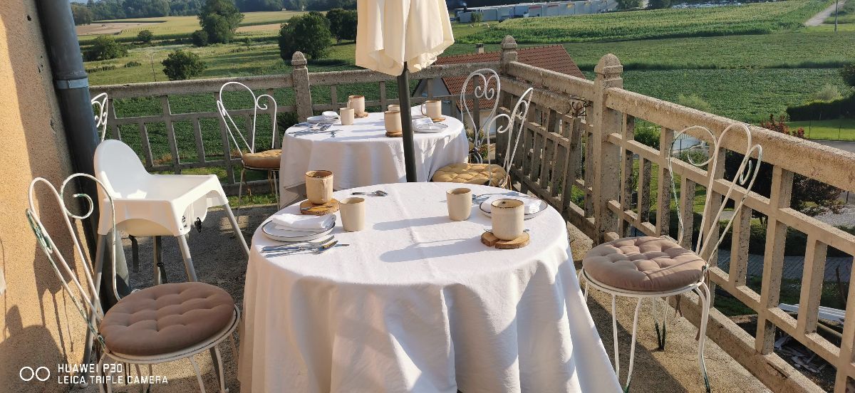 Un balcon terrasse situé à l’arrière de la maison avec une vue sur les montagnes du Bugey et à l’ombre d’un cerisier.