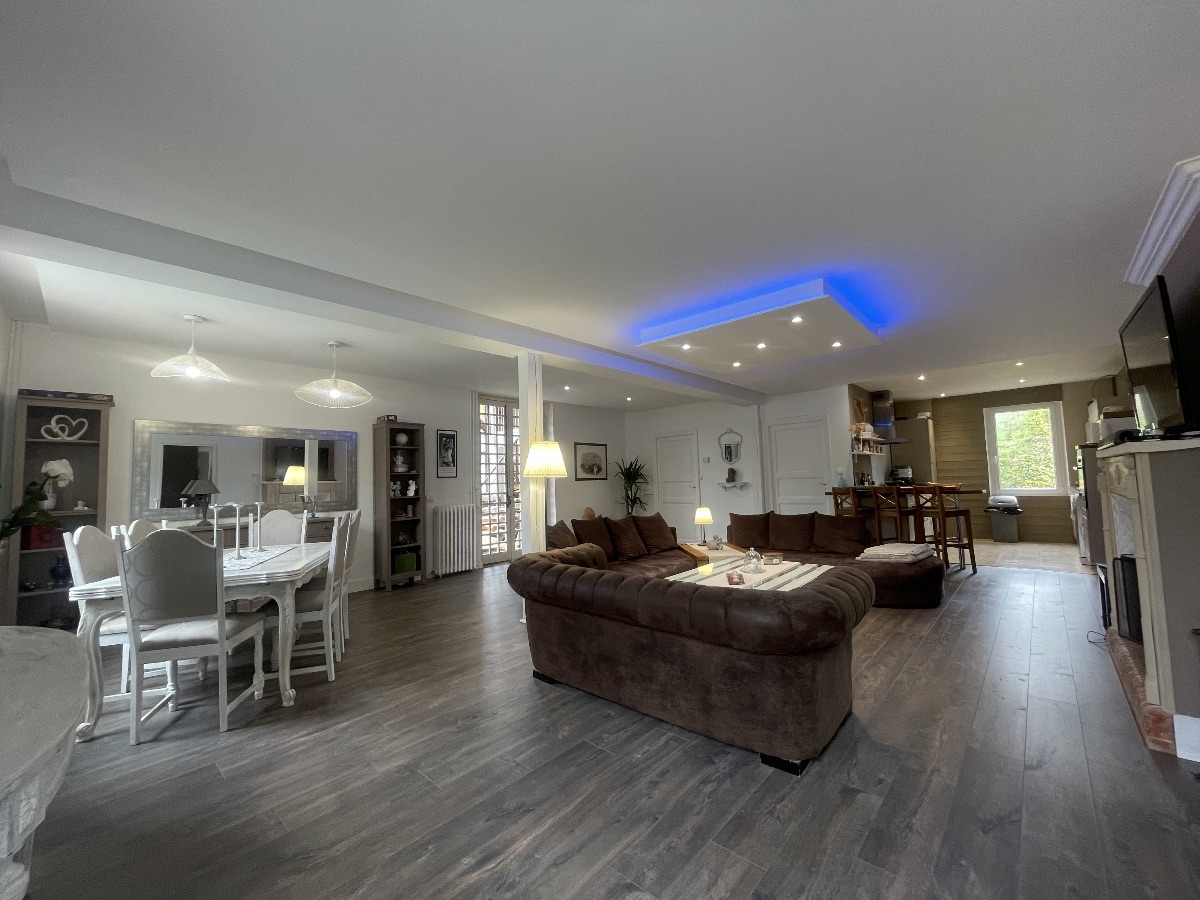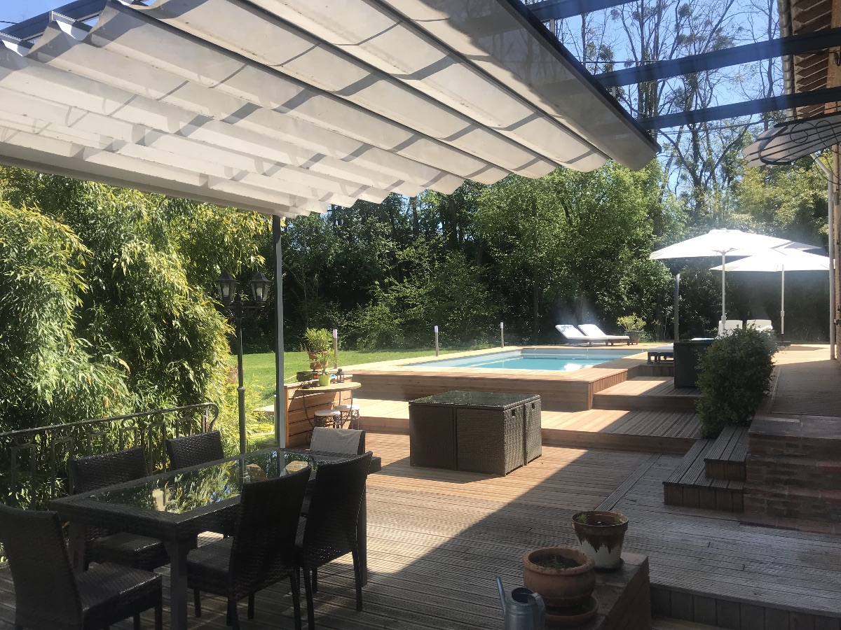 Située en bordure de rivière, vous profiterez en extérieur d'une terrasse bois de 200 m2 donnant sur une piscine de 9m x 4m chauffée avec traitement au sel, d'un spa balnéothérapie 5 places avec traitement au brome et d'un grand jardin.