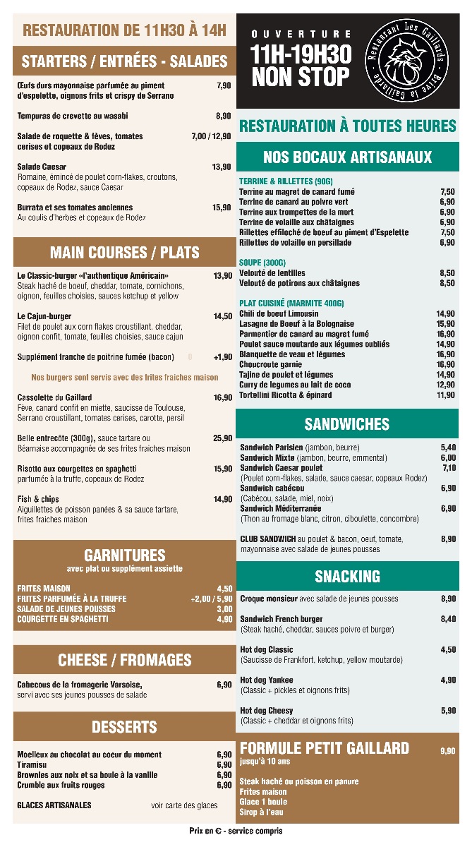 La cuisine est ouverte de 11h30 à 14h, nous porposons aussi un service de restauration à tout heure.