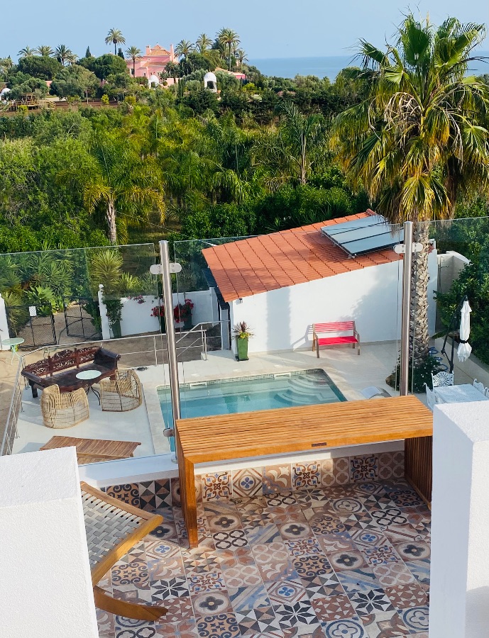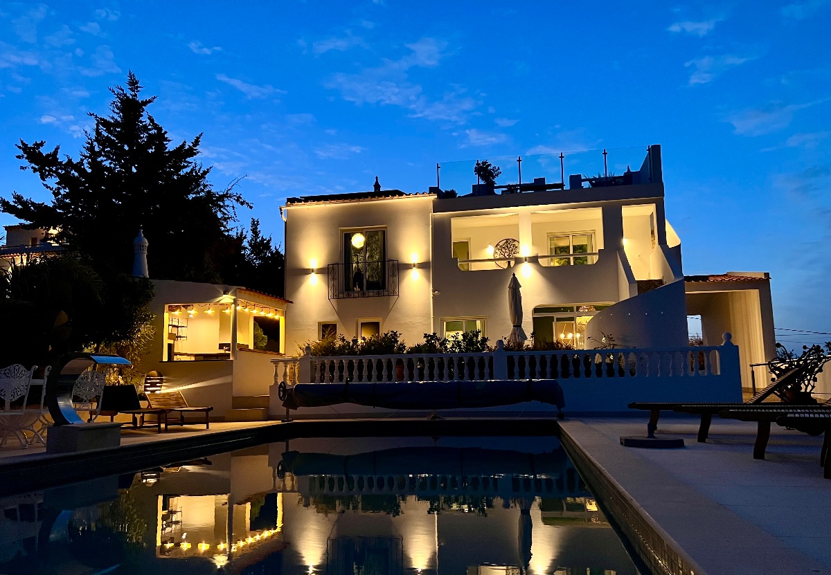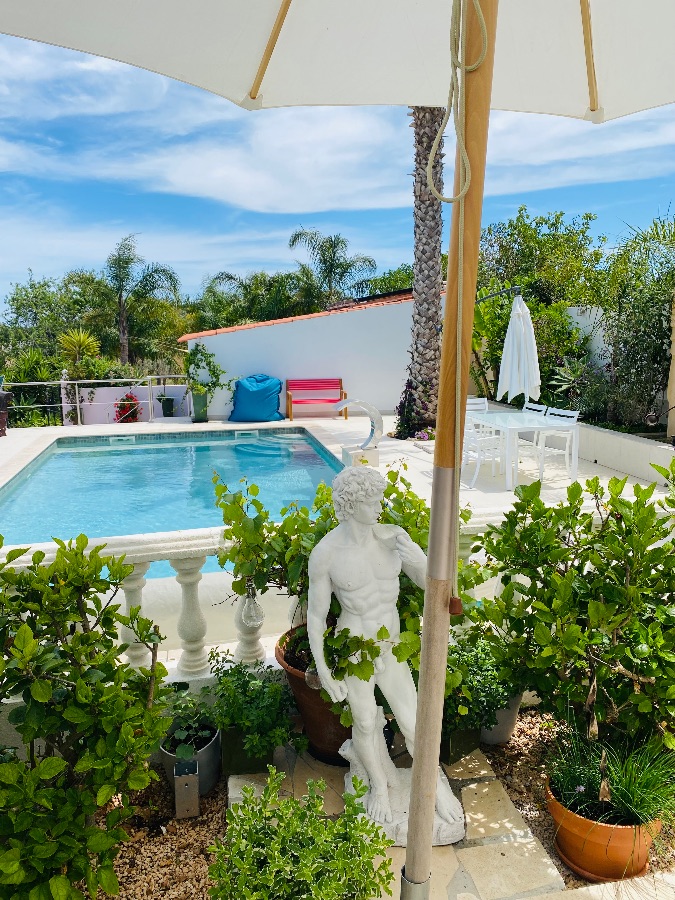 Détendez-vous sur la confortable terrasse sur le toit avec une vue fantastique sur les palmiers, la piscine, le jardin, la mer d'un côté et de l'autre les lointaines montagnes de Monchique. Le jardin comprend plus de 70 palmiers, arbres fruitiers, légumes et belles fleurs. Il y a aussi un étang avec des poissons rouges et des grenouilles.