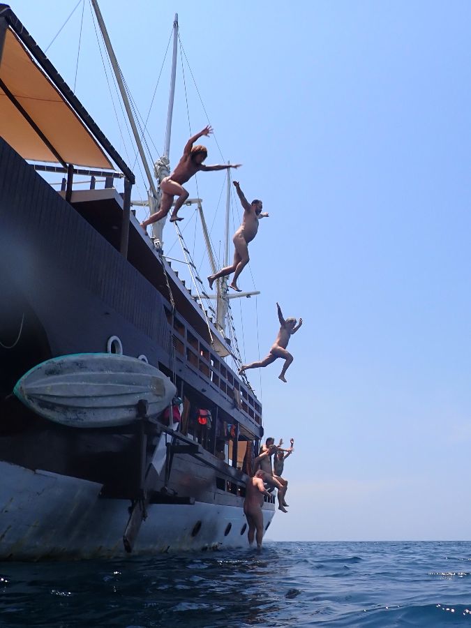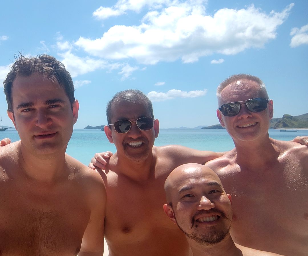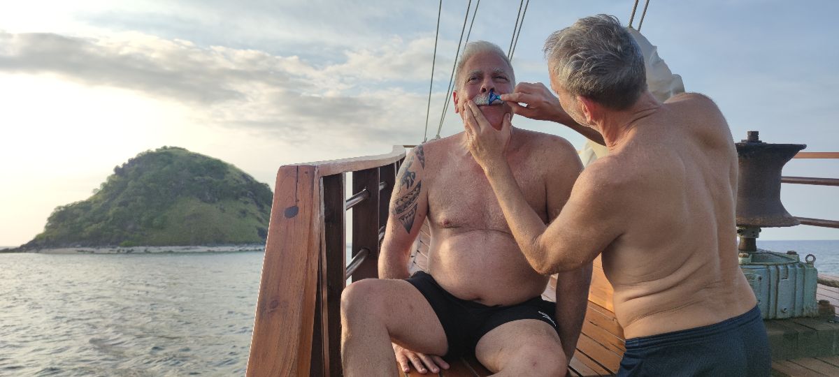 Notre voyage navigue autour de différentes îles du parc national de Komodo en Indonésie. Parce que les gars sont nus sur le bateau, notre objectif est de visiter des endroits à la fois inhabités et exempts d'autres navires. Nous gardons un profil bas en public et nous respectons toujours les cultures locales. Et donc nous sommes discrets.