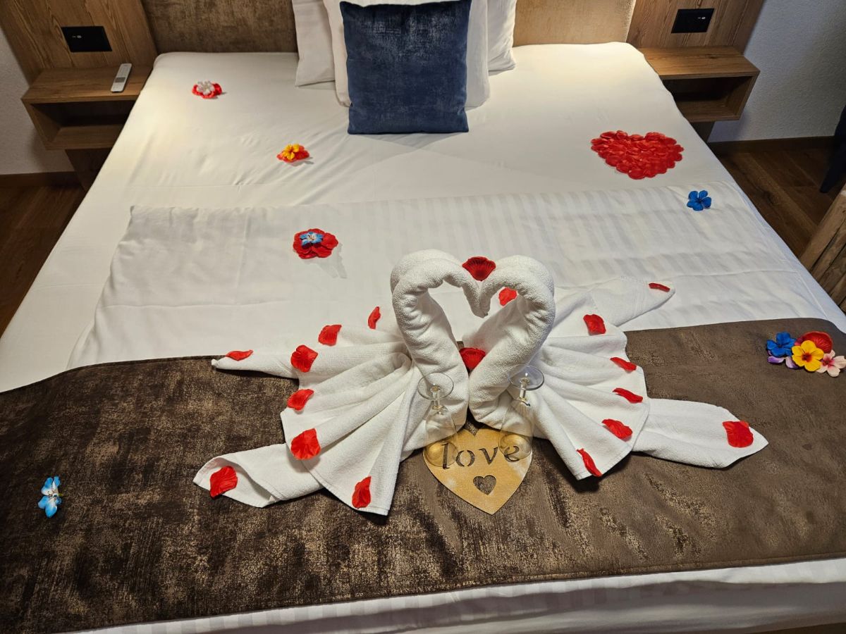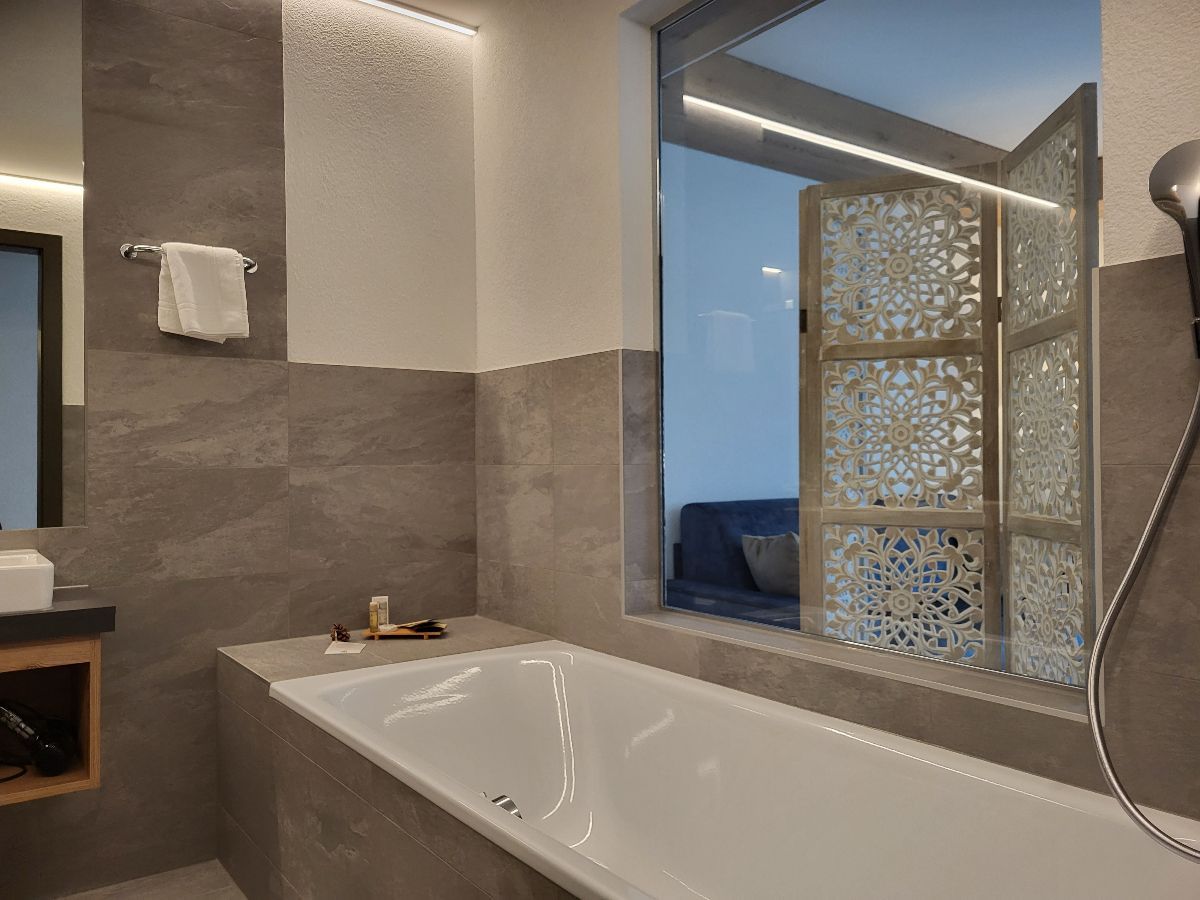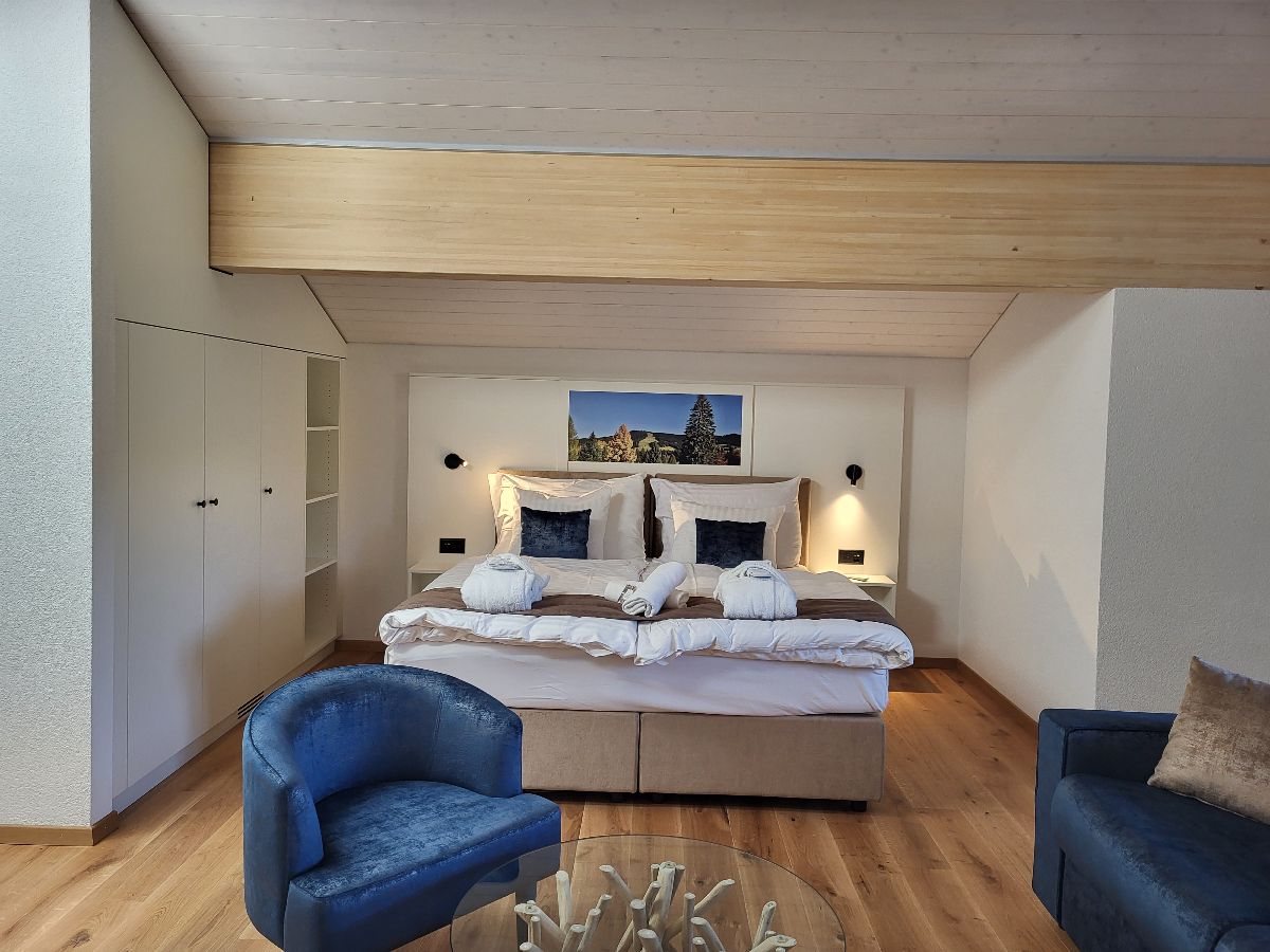 Suite Junior : Chambre de 18 à 20 M2 toutes composées d'un lit double, balcon avec vue sur le Niremont, petit salon, TV, WIFI, salle de bain avec douche, coffre fort, peignoir et slippers et petit set d'accueil.