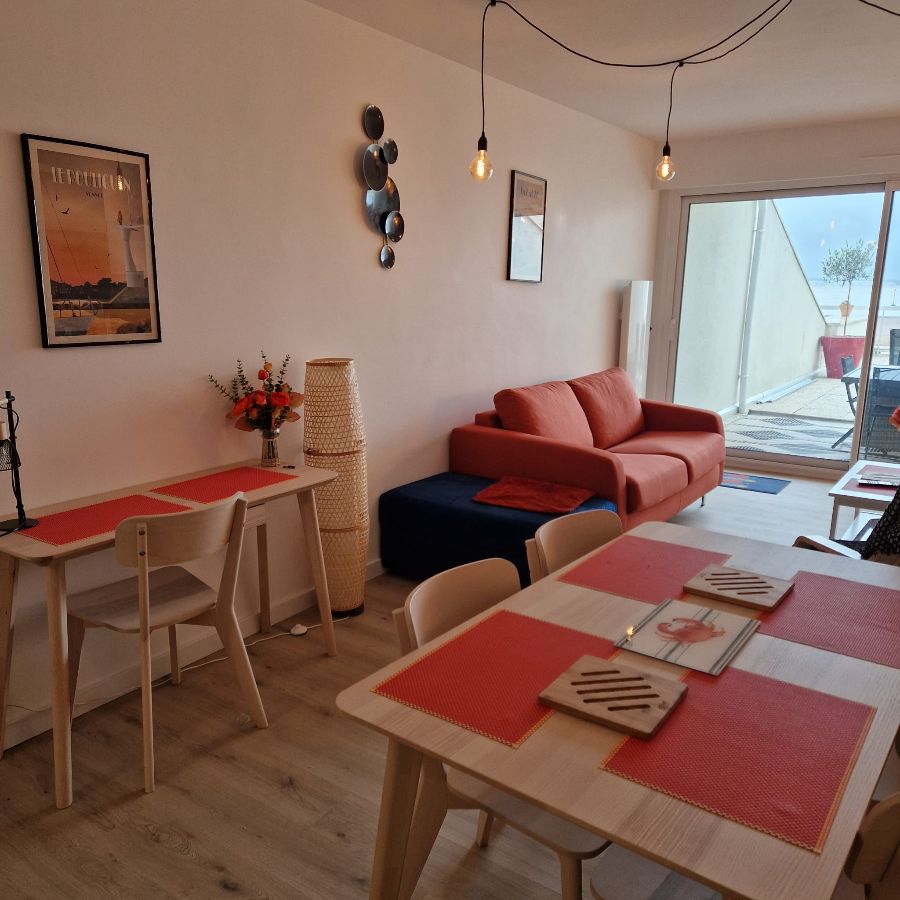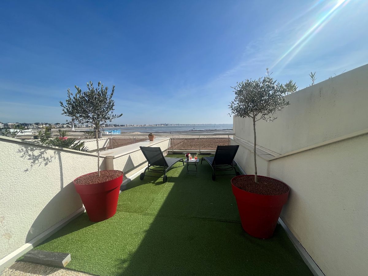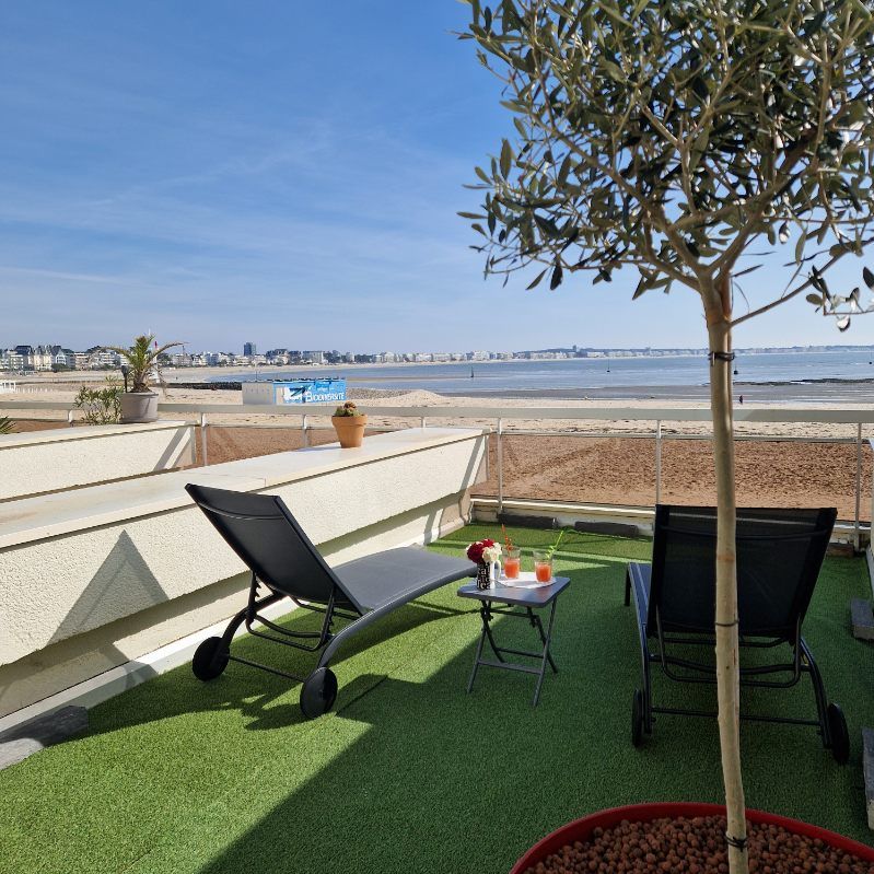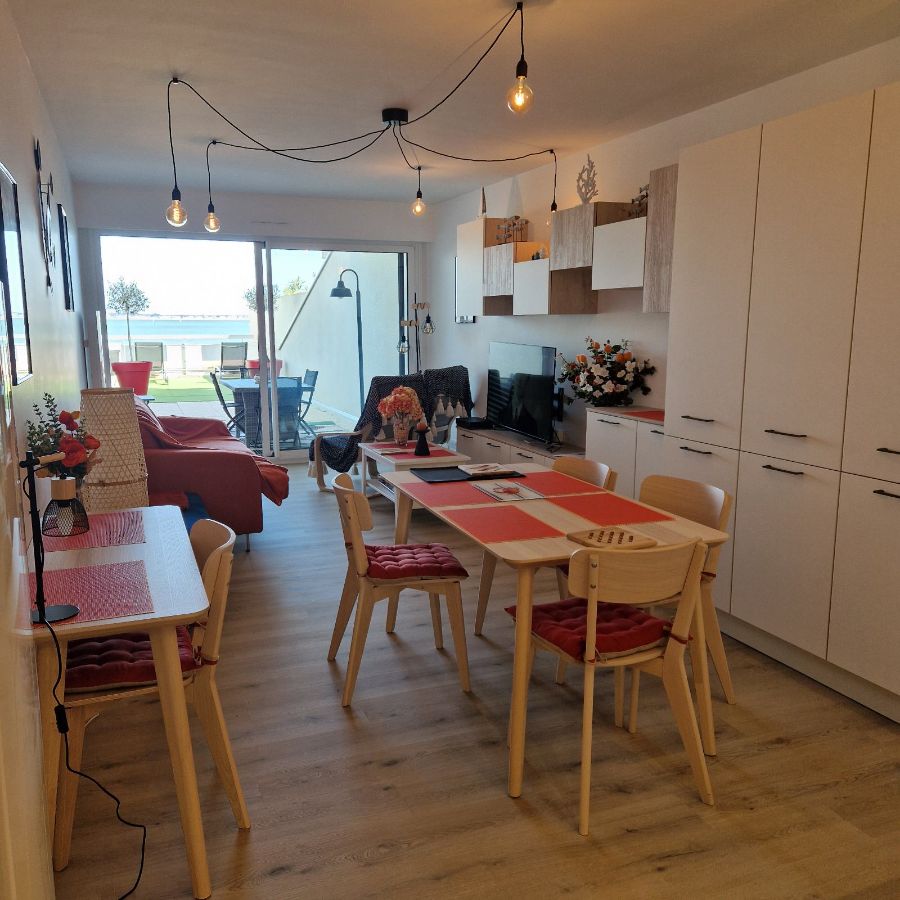 Un vaste séjour donnant sur une grande terrasse avec une vue imprenable sur la baie de la Baule. Appartement entièrement rénové, cuisine équipée, salle de bain avec toilettes séparés et une chambre disposant d'un beau balcon.