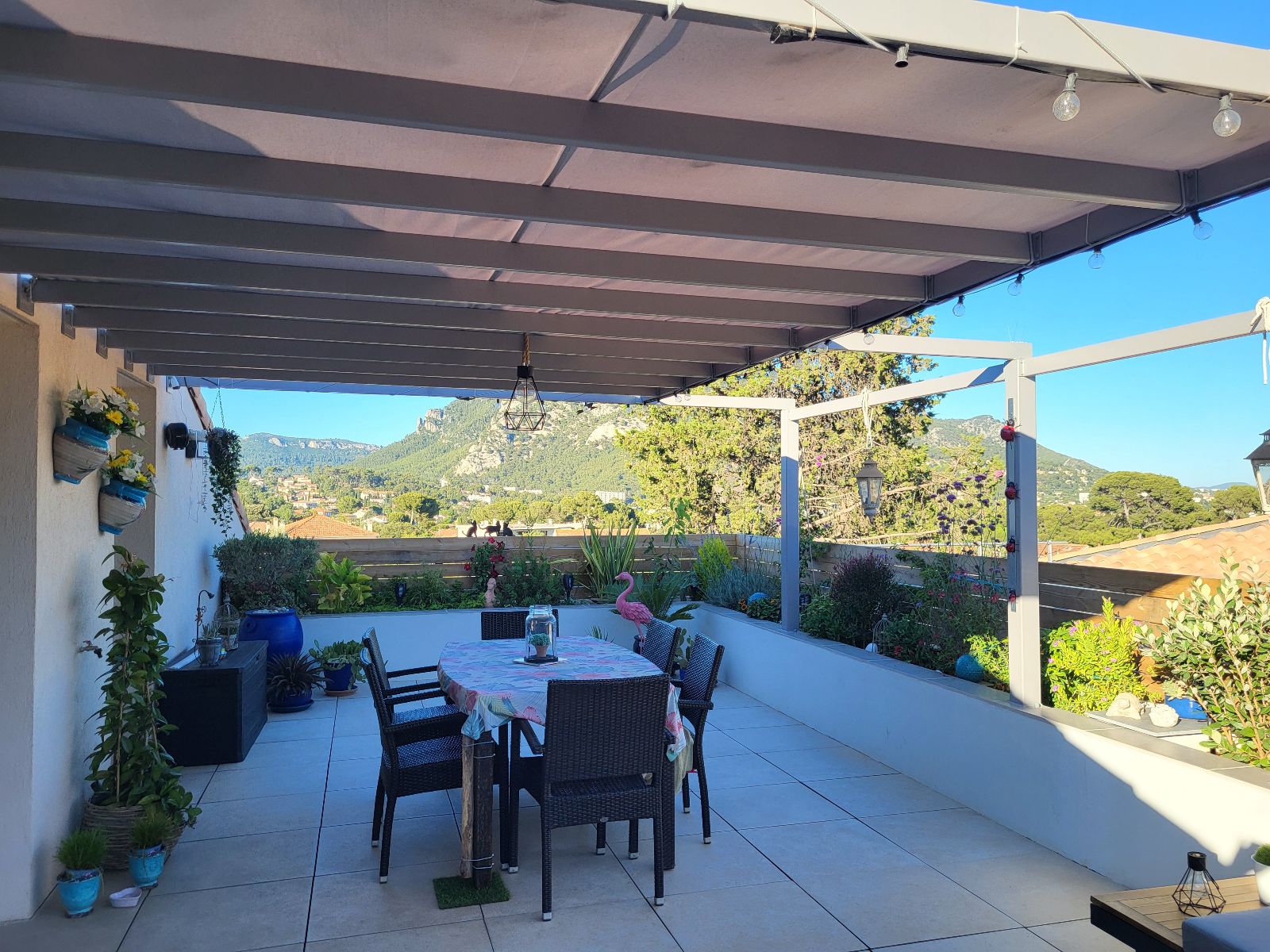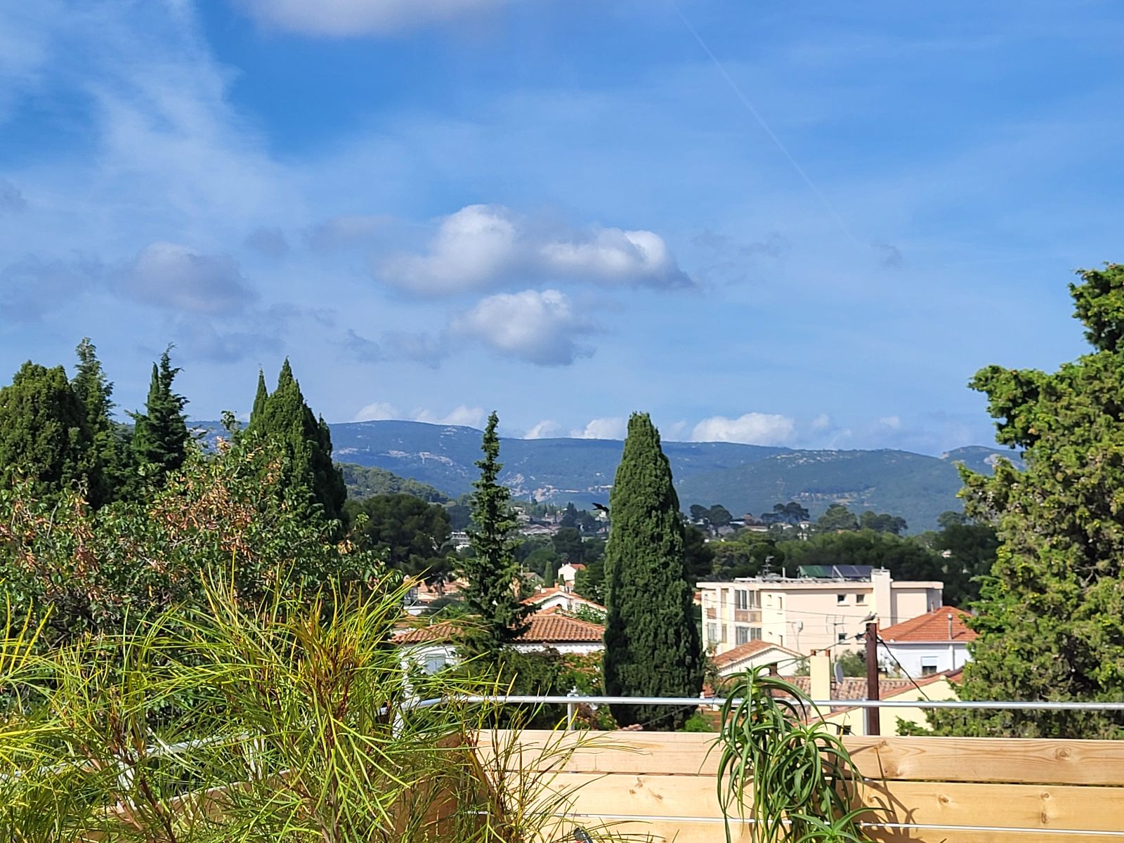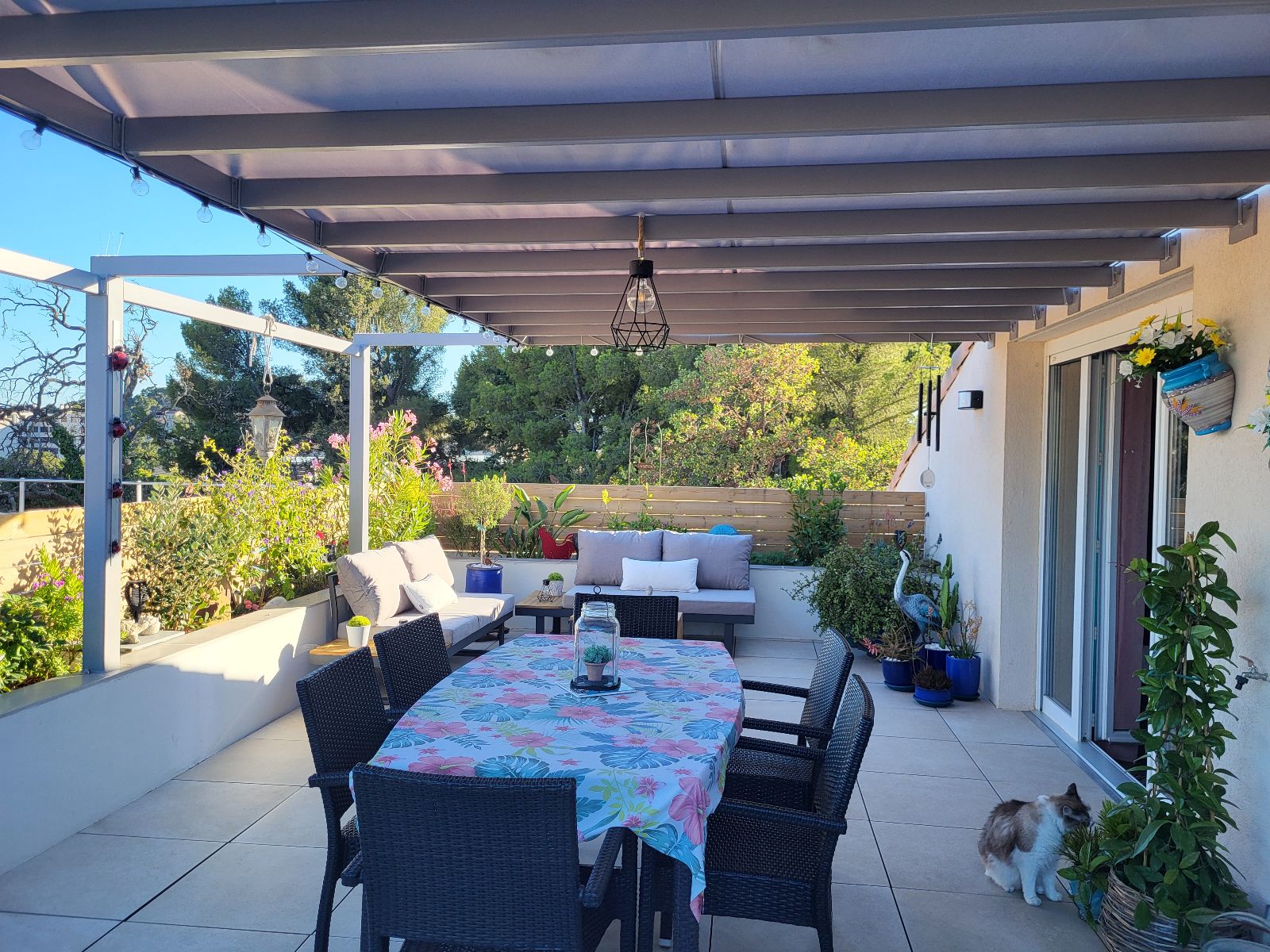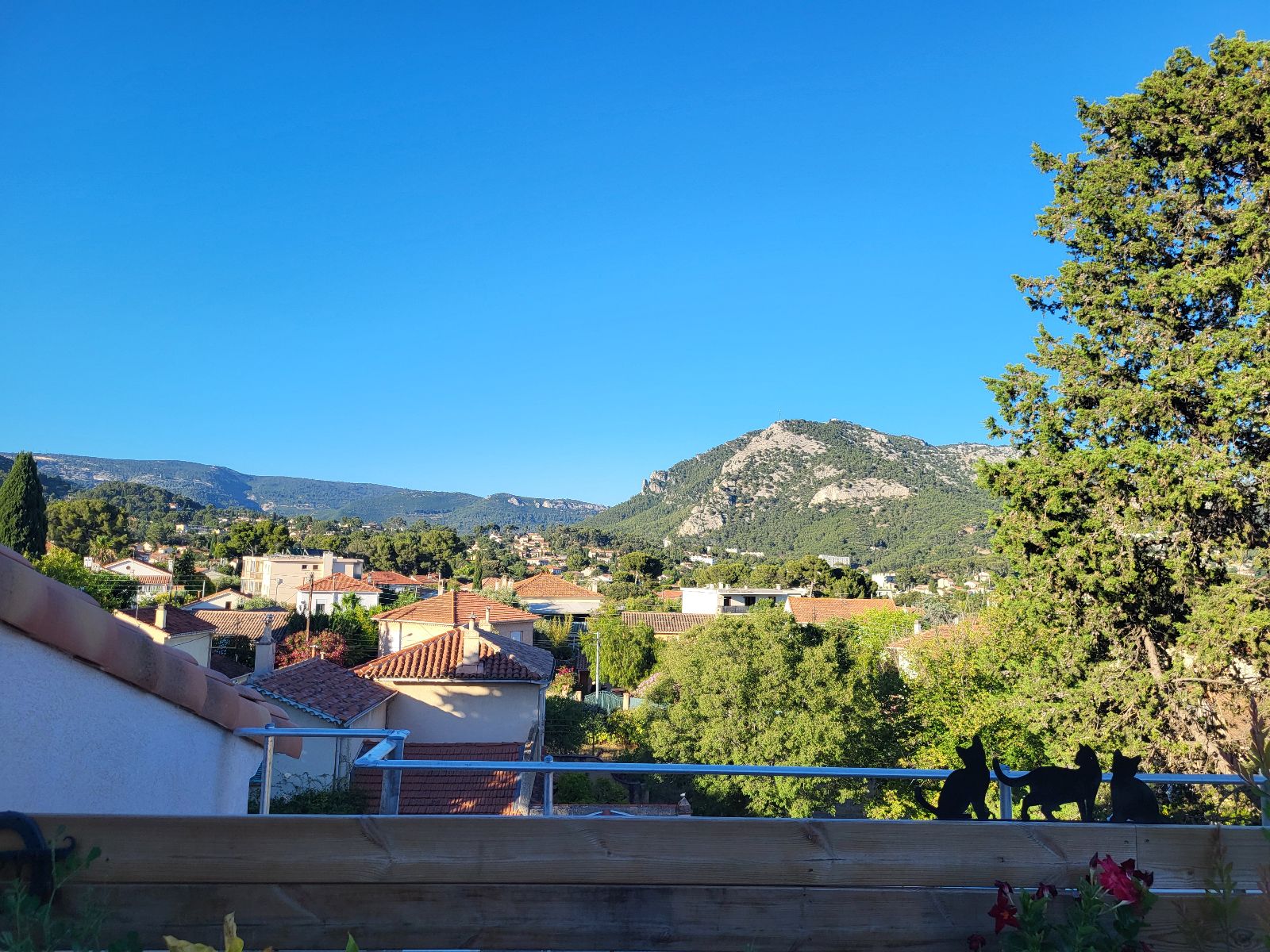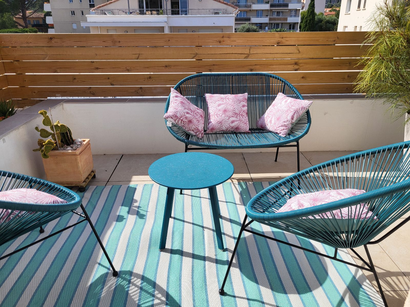Vous aurez accès à notre salon ainsi qu’a notre terrasse sud donnant en partie sur la mer et le Mont Faron.