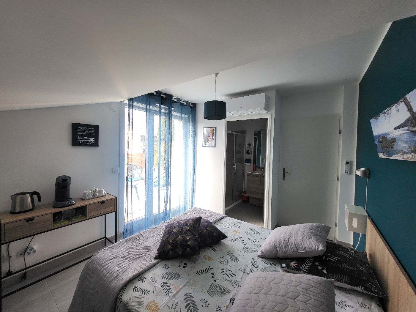Nous vous proposons une chambre privée dans notre appartement terrasse situé au 3eme et dernier étage d'une résidence neuve dans un quartier calme de Toulon ouest. Que vous cherchiez à vous loger pour une nuit en transit pour l’Italie, La Corse, les iles de Méditerranée ou que vous décidiez de passer quelques jours à découvrir Toulon, nous serons heureux de vous accueillir.