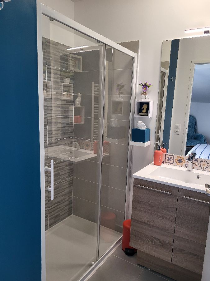 Notre appartement terrasse au 3émé étage (seul à cet étage), avec ascenseur. Votre chambre avec lit de 160 x 200 dispose d’une salle d’eau privée avec un grande douche ainsi que des toilettes privées dans le couloir d’accès à votre chambre.
