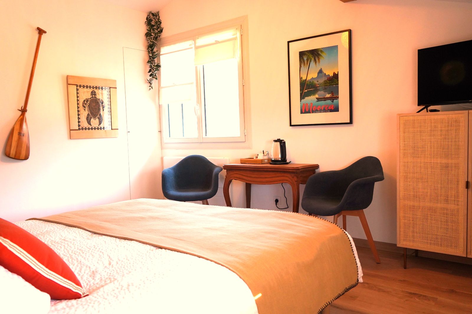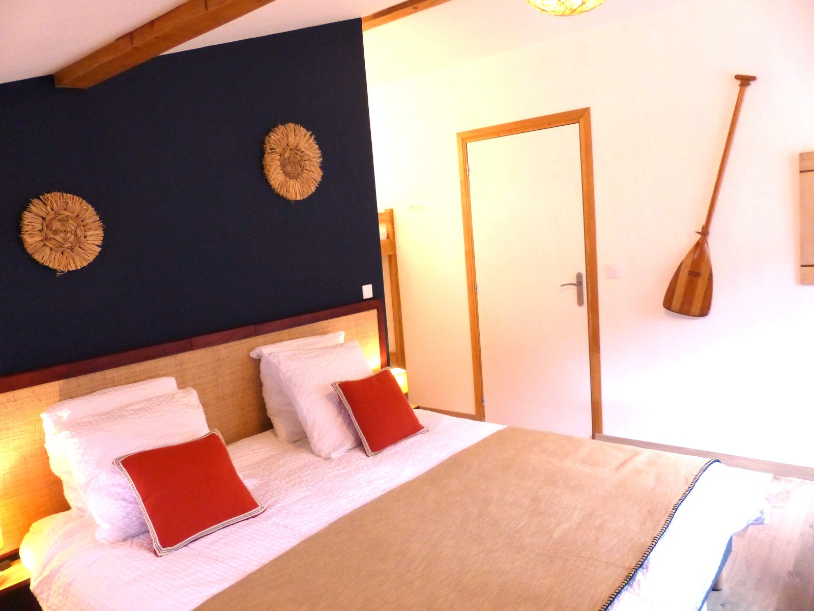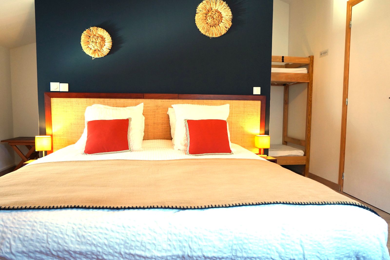 La chambre TAHITI, 24m² pour deux adultes (possibilité de couchage supplémentaire pour deux enfants) avec salle de bain équipée d’une baignoire et WC. Cette chambre est composée d’un lit king size de 180 cm et de 2 lits superposés de 70 cm.