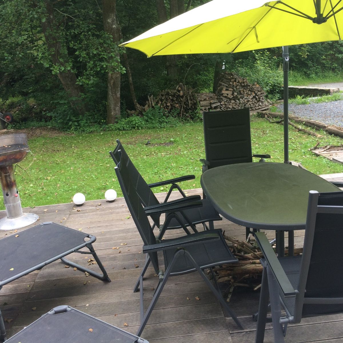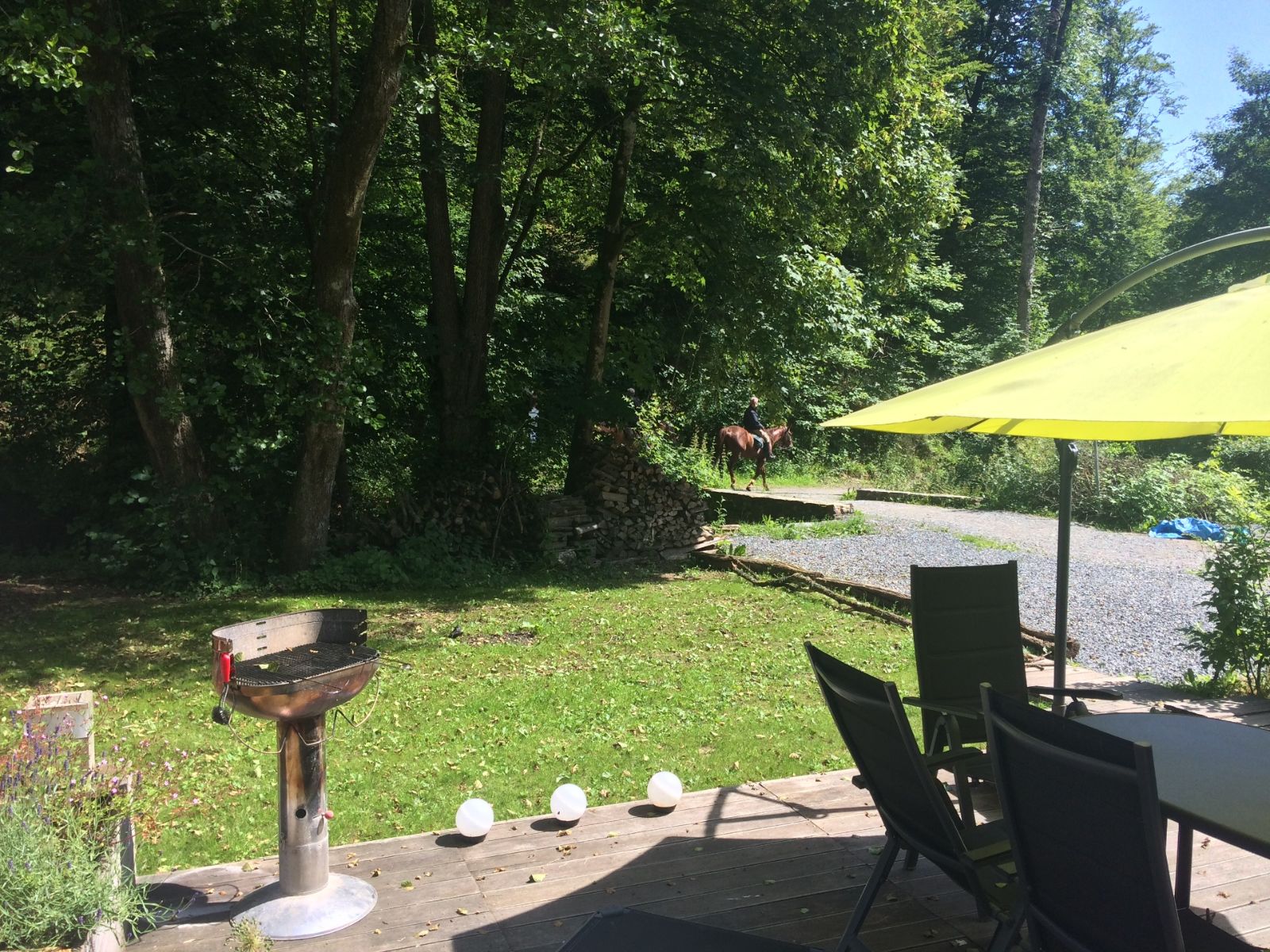 Grande terrasse en bois et jardin privatif avec endroit pour feu de camp