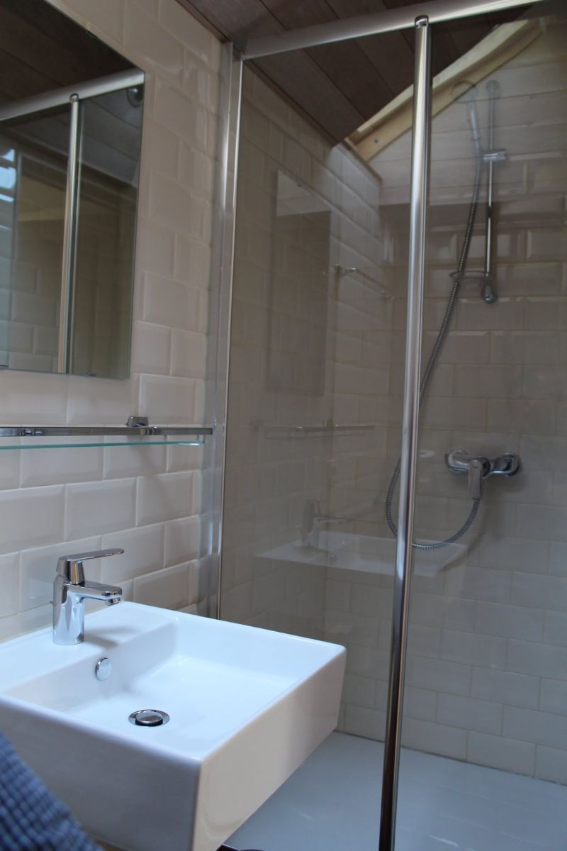 Au Rez-de-chaussée : Grande chambre à coucher avec lit double (180 cm) et lit superposé et une Salle de bain avec douche et toilettes.