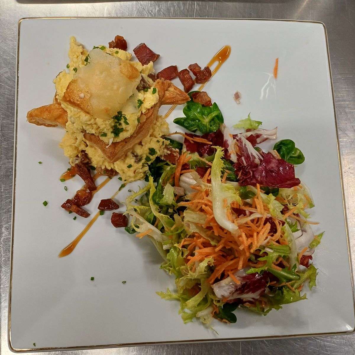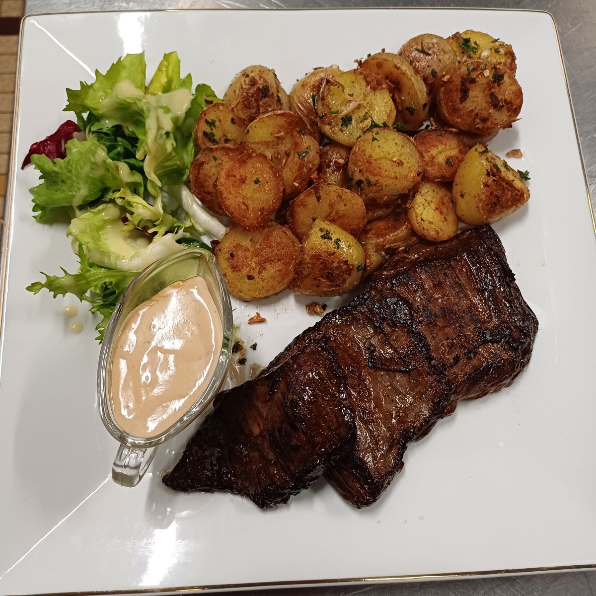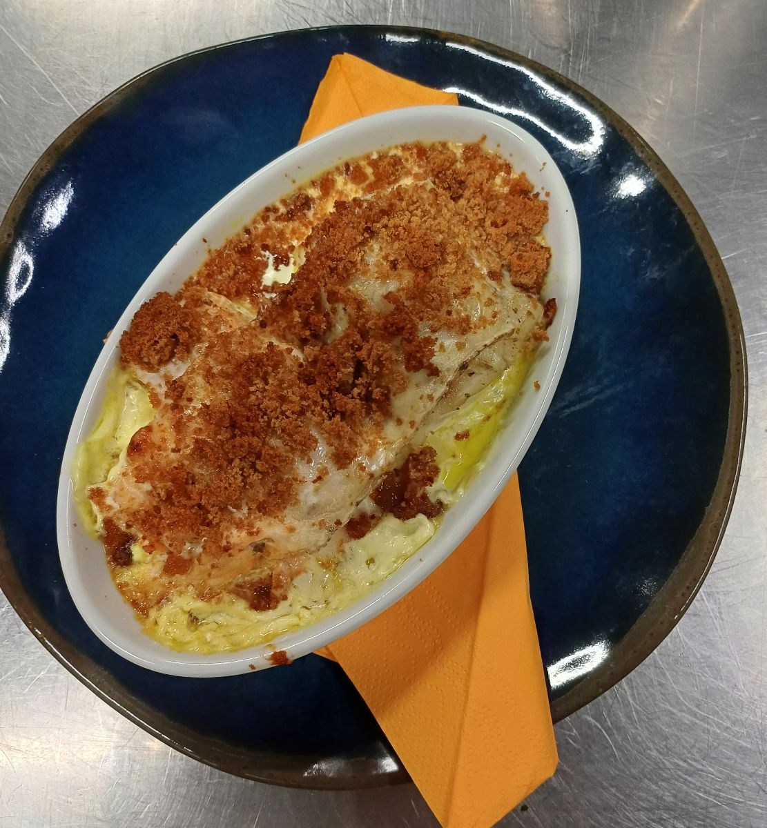 Notre plat signature est l'Alliance de Poissons : 2 poissons (sans arrête) déposés sur une julienne de légumes avec sa croute de pain d'épice gratiné avec un fromage au four.
