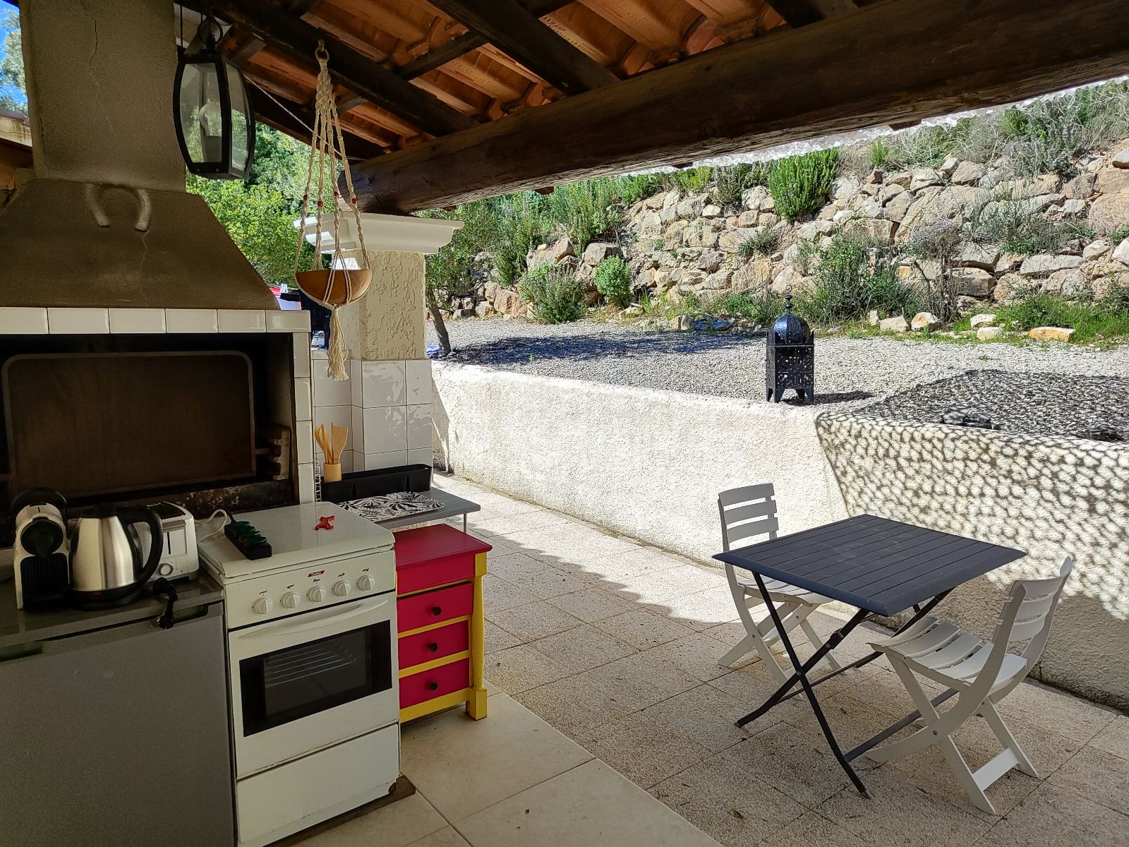 Cette chambre est équipée d'un lit queen size ( forcement), salle de bain, d'une clim réversible, TV, mini frigo, cafetiere Nespresso...Et une petite cuisine d'été en terrasse mais l'été seulement pour le moment.